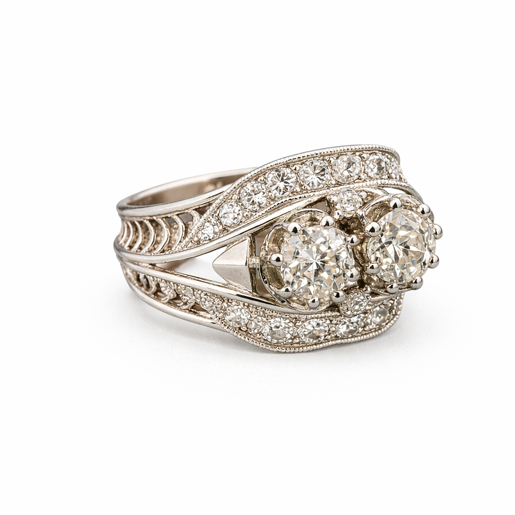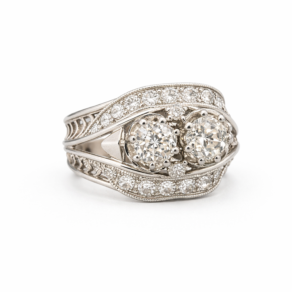 Anillo antiguo elaborado en platino protagonizado por dos diamantes centrales talla antigua que destacan por su luminosidad y equilibrio. La pieza se enriquece con una delicada orla de diamantes talla rosa engastados en carril que recorren el frontal y laterales, aportando profundidad y brillo continuo