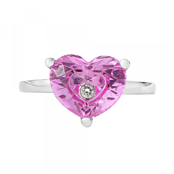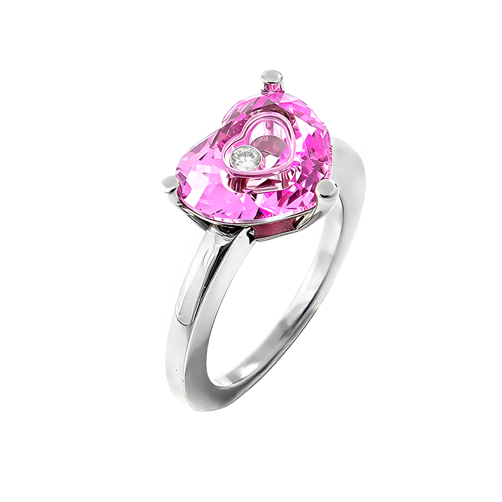 Anillo Happy Diamonds de Chopar, es una pieza de alta joyería, elaborado en oro blanco de 18 quilates con cuarzo rosa en talla corazón, albergando un diamante talla brillante con movimiento propio. Una exclusiva pieza de segunda mano en excelente estado que ha sido examinada y verificada para darle una segunda vida con total garantía.