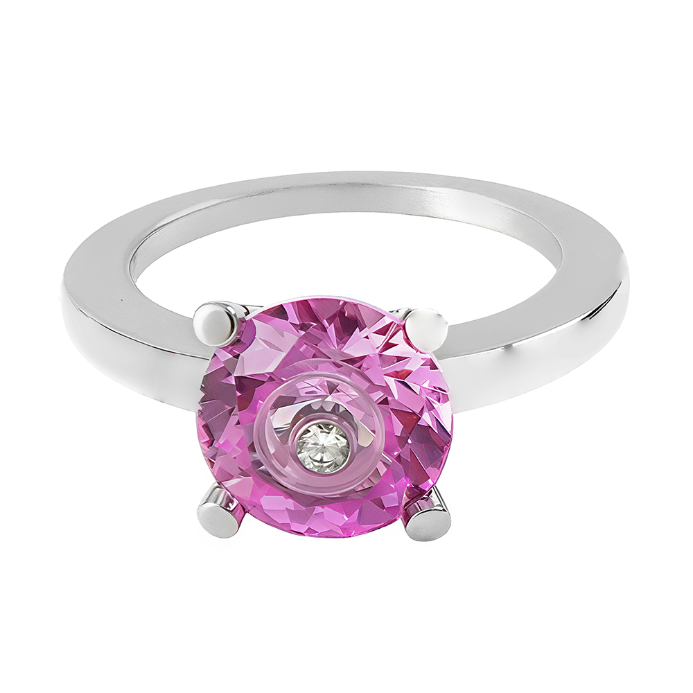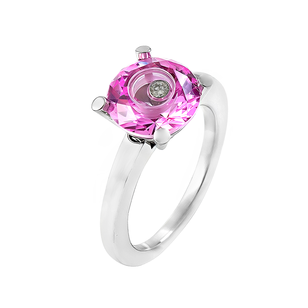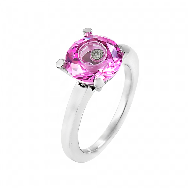 Anillo Happy Diamonds de Chopar, es una pieza de alta joyería, elaborado en oro blanco de 18 quilates con cuarzo rosa en talla redonda, albergando un diamante talla brillante de 0.04cts con movimiento propio. Una exclusiva pieza de segunda mano en excelente estado que ha sido examinada y verificada para darle una segunda vida con total garantía.