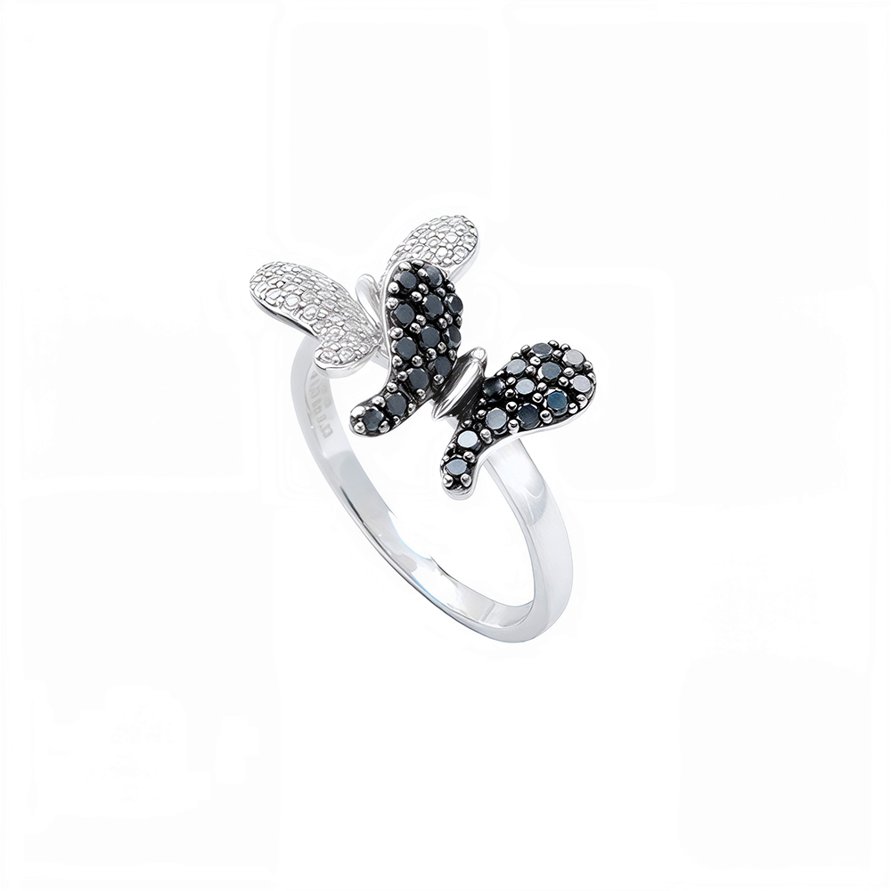 Elegante y original anillo sobre montura de oro blanco 18kt con diseño mariposa decorada con pequeños diamantes blancos y negros de talla brillante, aportando contraste y brillo que dan personalidad a esta femenina pieza.