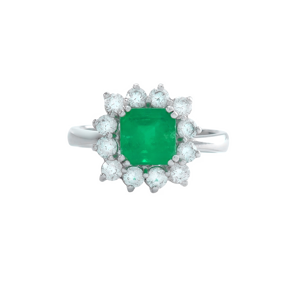Este anillo de oro blanco de 18kt presenta una esmeralda central colombiana rodeada por una orla de diamantes talla brillante, sofisticadamente elegante.