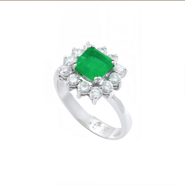 Exclusivo anillo certificado de oro blanco de 18kt modelo roseta. Su esmeralda central colombiana natural contrasta con orla de diamantes talla brillante, dotando de un brillo especial a esta maravillosa joya de diseño atemporal, ideal como anillo de compromiso.