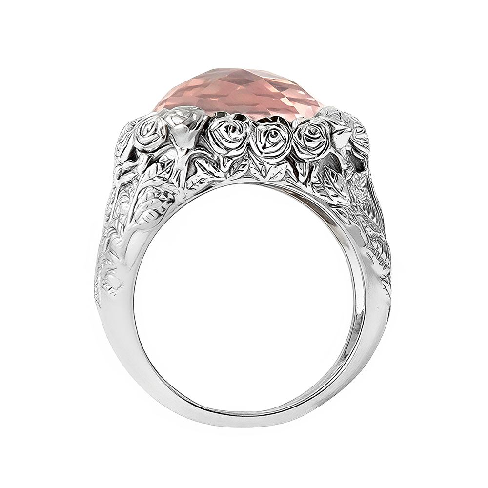 Anillo «Rosas» de Carrera y Carrera años 90-2000, elaborado en oro blanco de 18 quilates y engaste de cuarzo rosa facetado en talla checkerboard. Esta joya viene marcada por la precisión artesanal de su brazo con grabado de rosas en relieve. Una exclusiva pieza de segunda mano en excelente estado que ha sido restaurada con los recursos existentes para darle una segunda vida conservando toda su historia y lista para continuar la tuya.