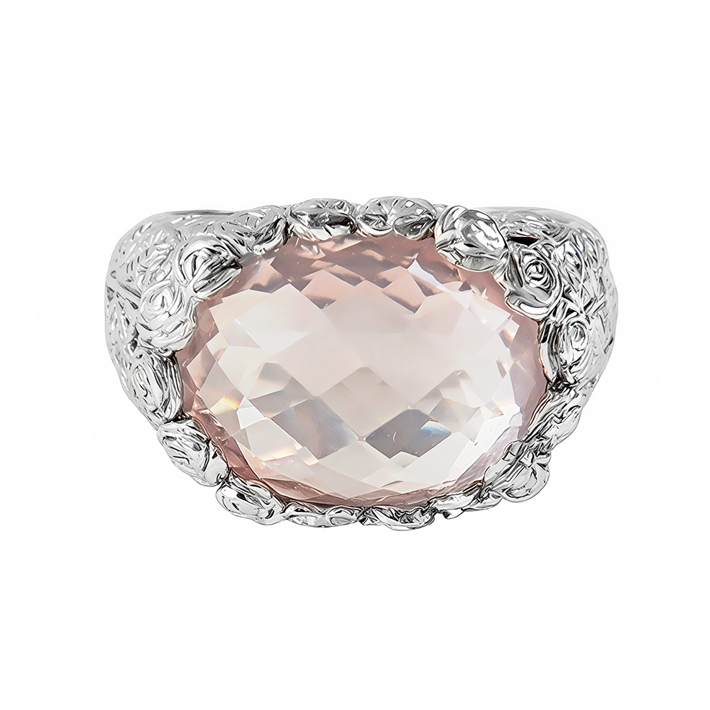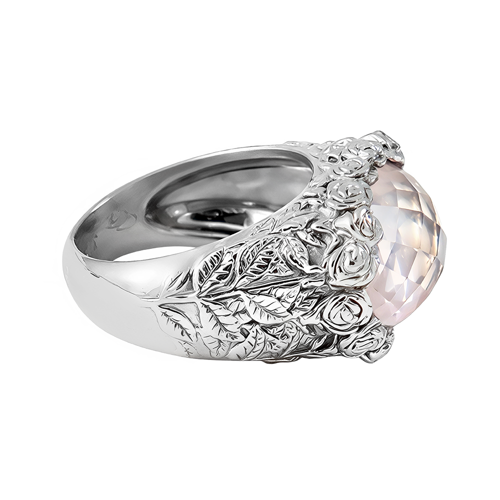 Este anillo de Carrera y Carrera, es una autentica escultura en miniatura. Su diseño envuelve un impresionante cuarzo rosa facetado, cuya suave y delicada luz contrasta con la fuerza del oro blanco de 18 quilares.