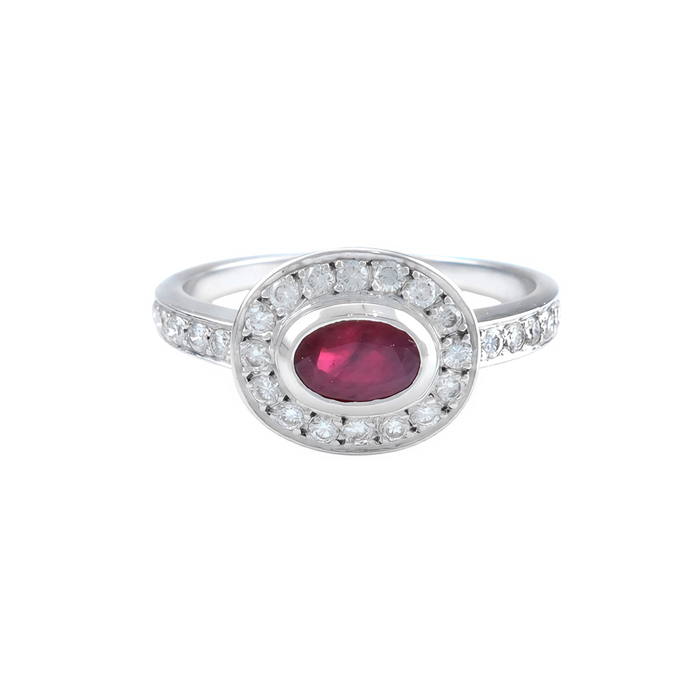 Anillo de oro blanco 18kt modelo roseta con rubí central oval y orla de diamantes. Una elegante joya de estilo clásico. Un diseño de inspiración histórica, atemporal y llena de significado.