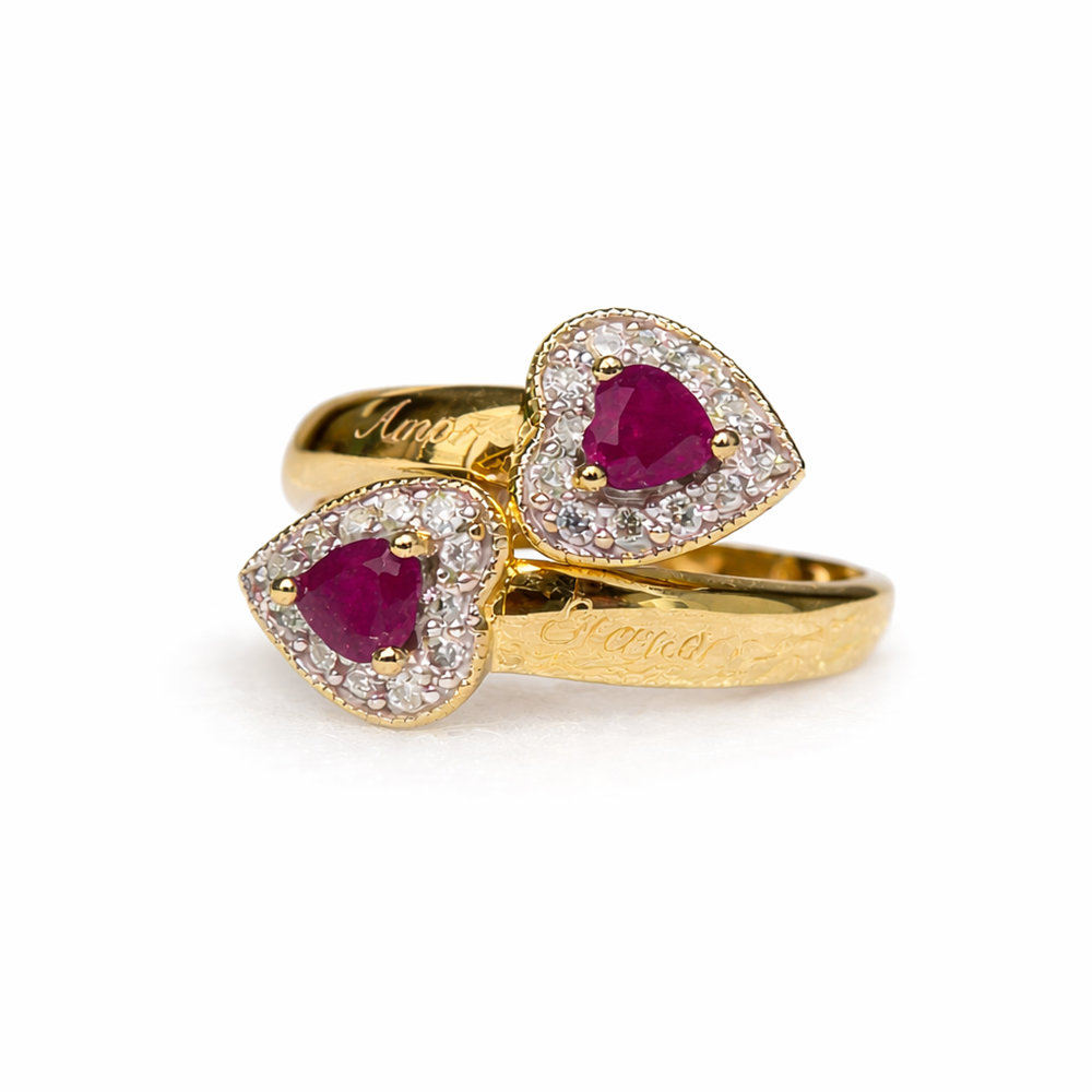 Anillo doble tipo «tu y yo» realizado en oro amarillo con inscripción «amor eterno» y protagonizado por dos rubíes talla corazón, símbolo del amor eterno y la pasión. Cada rubí está delicadamente rodeado por una orla de diamantes que realzan su color y aportan un brillo sofisticado y equilibrado.