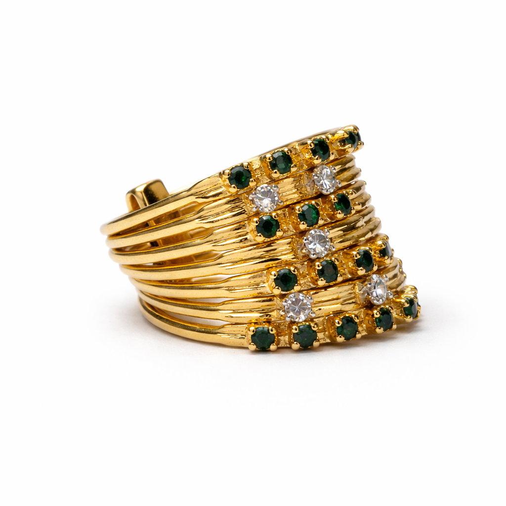 El diseño escalonado del anillo crea un efecto visual dinámico, característico de la joyería europea, un periodo en el que las piezas comenzaron a adquirir mayor volumen y protagonismo.