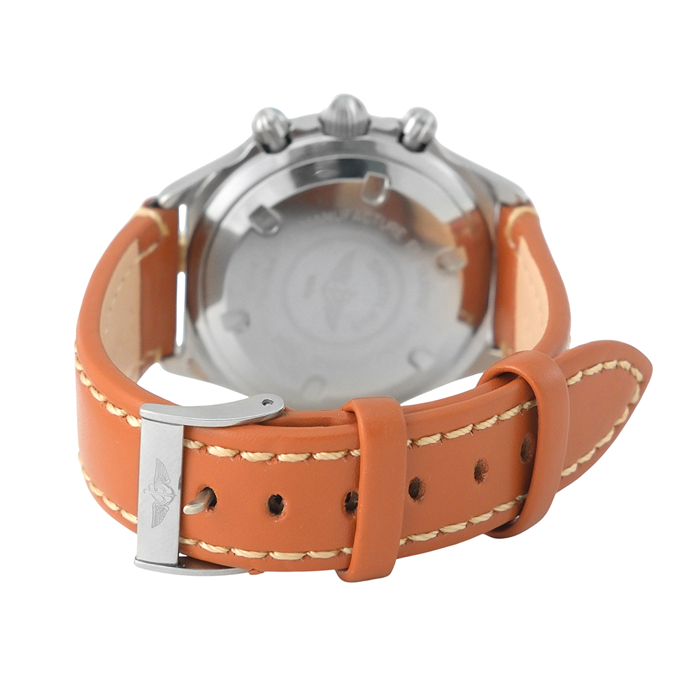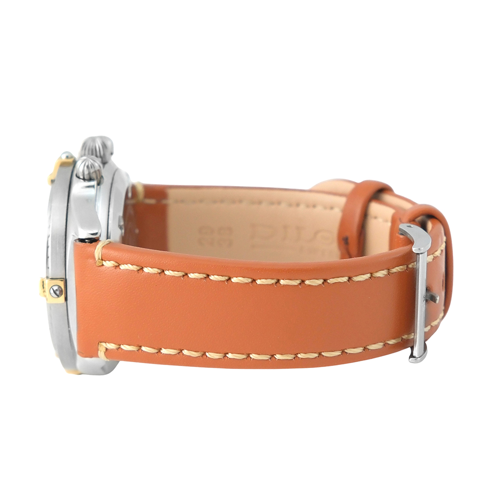Equipado con movimiento automático, función de cronógrafo, bisel giratorio con detalles en oro amarillo de 18 quilates, esfera color crema, cristal de zafiro, correa de piel no original con cierre de hebilla de acero y hermeticidad hasta 30 metros.