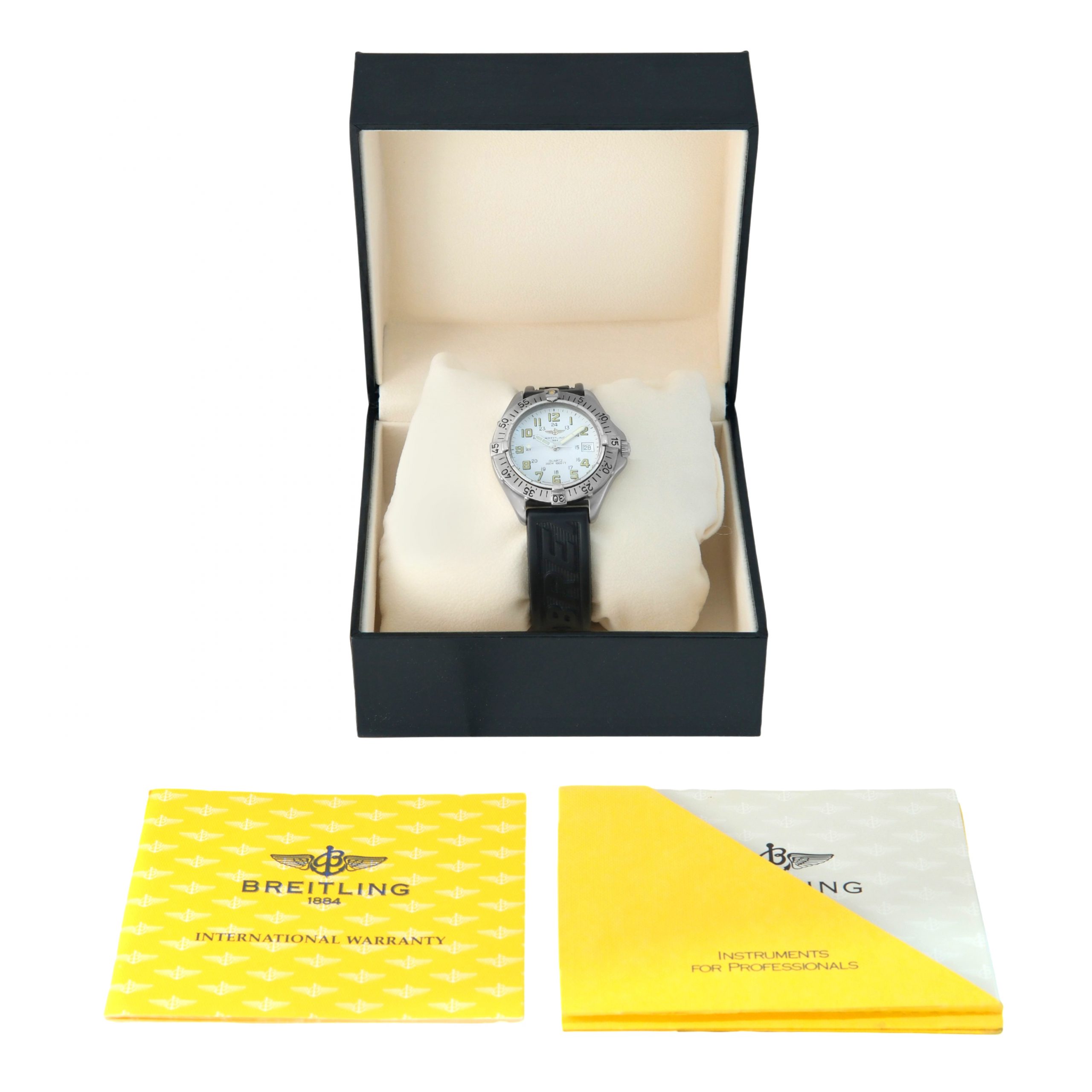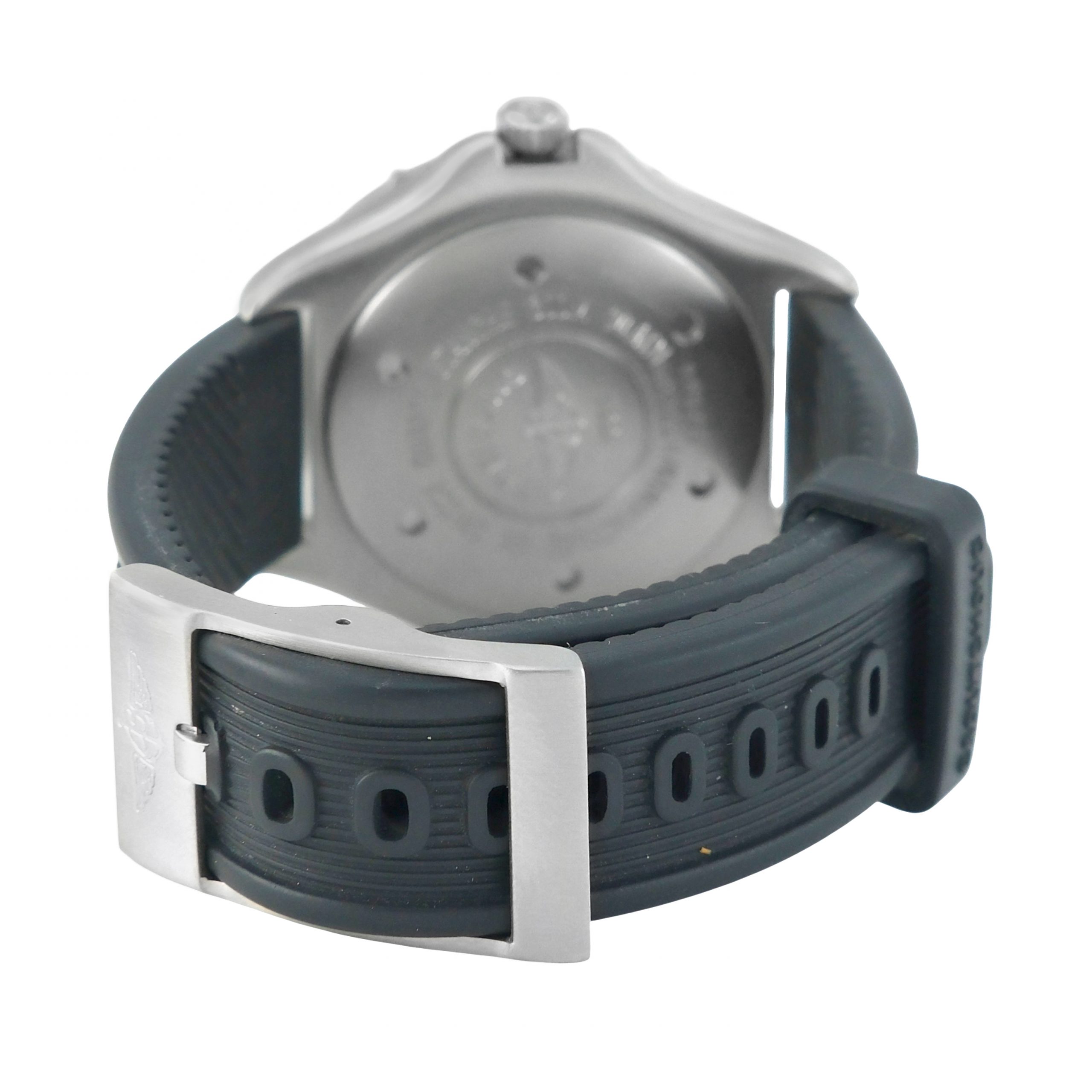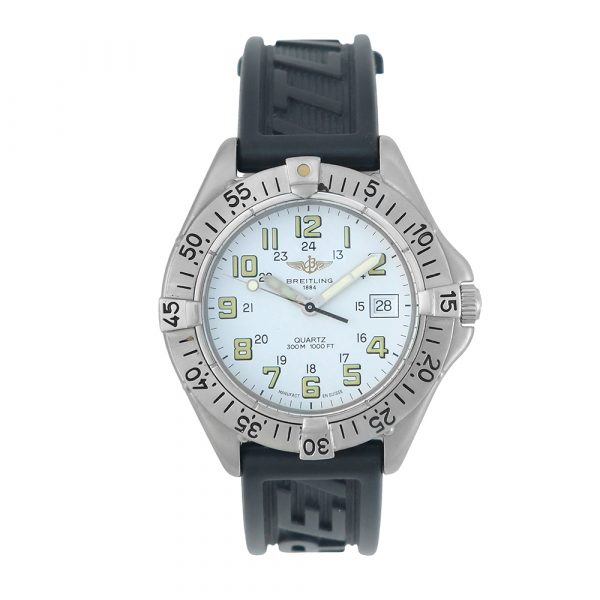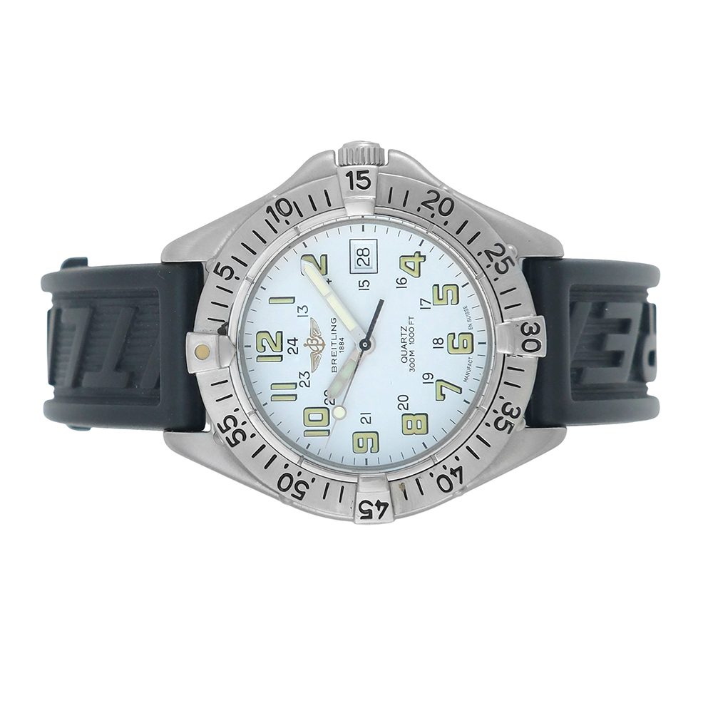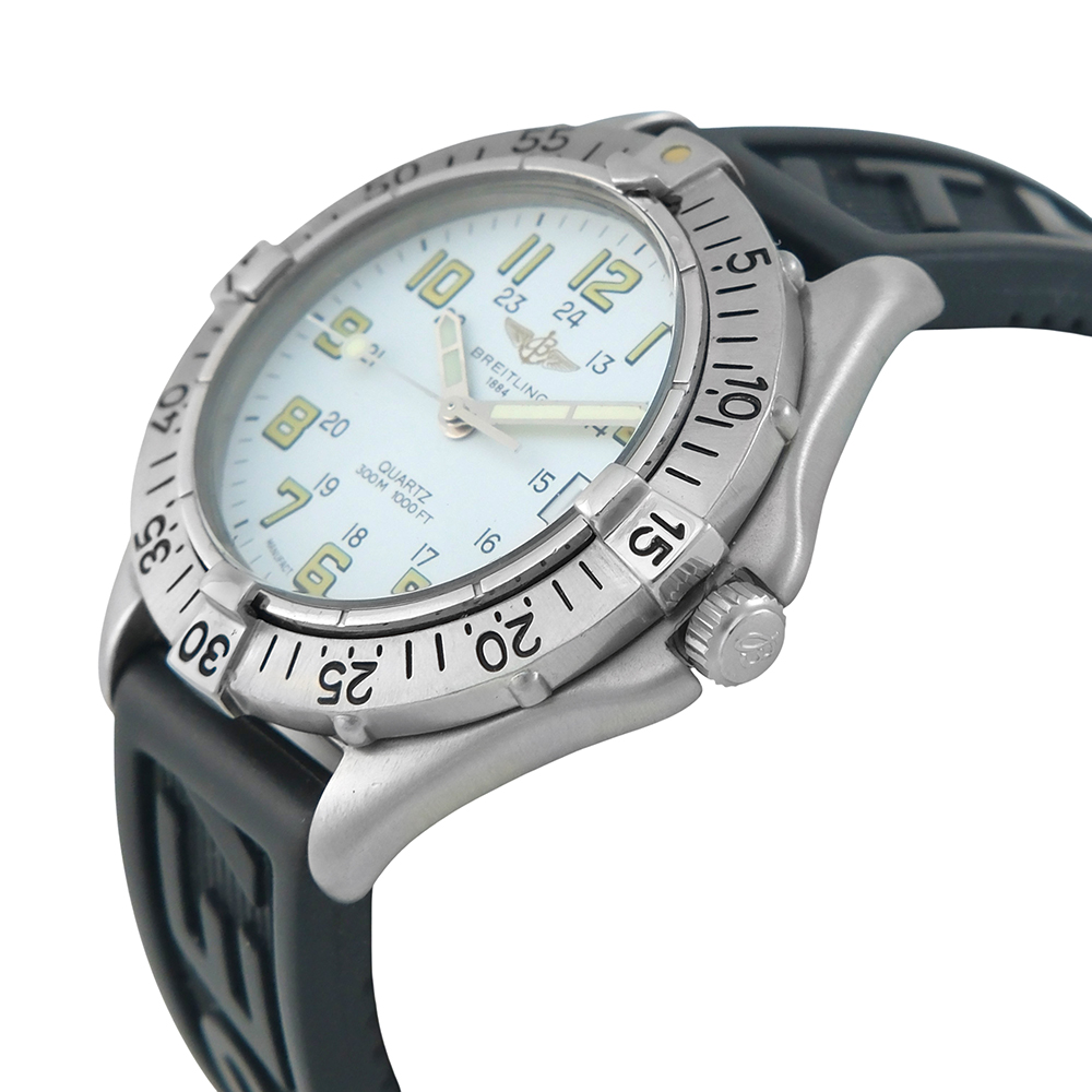 Este Breitling Colt Ocean 38mm Ref.-A57035 es un reloj de segunda mano, autenticado y verificado con 2 años de garantía, estuche Carrera y documentación. Año 1998. Excelente estado de conservación. Equipado con movimiento de cuarzo calibre B57, esfera blanca con números arábigos y luminiscencia, cristal de zafiro, bisel giratorio unidireccional, brazalete de caucho negro con hebilla ardillón (+correa adicional piel marrón) y hermeticidad hasta 300 metros. Envíos gratuitos en península y asegurados en todo el mundo.