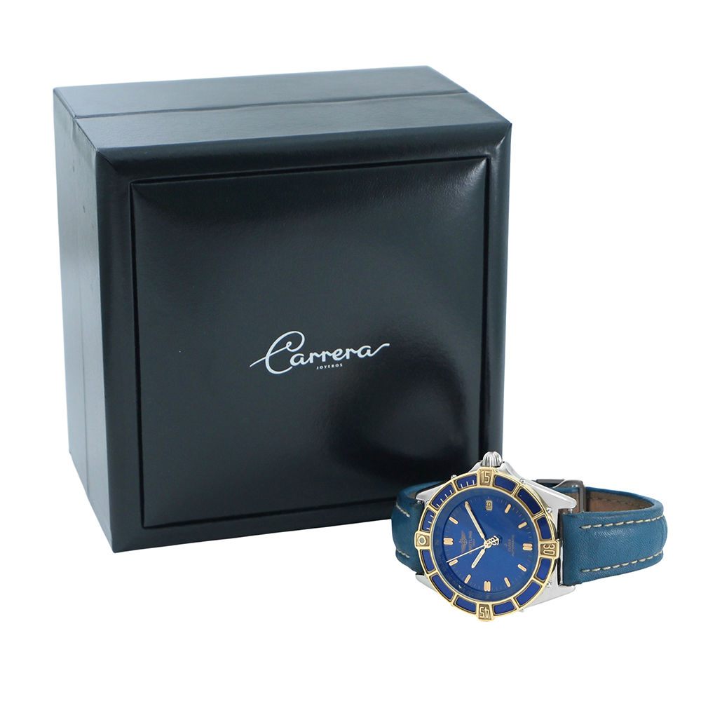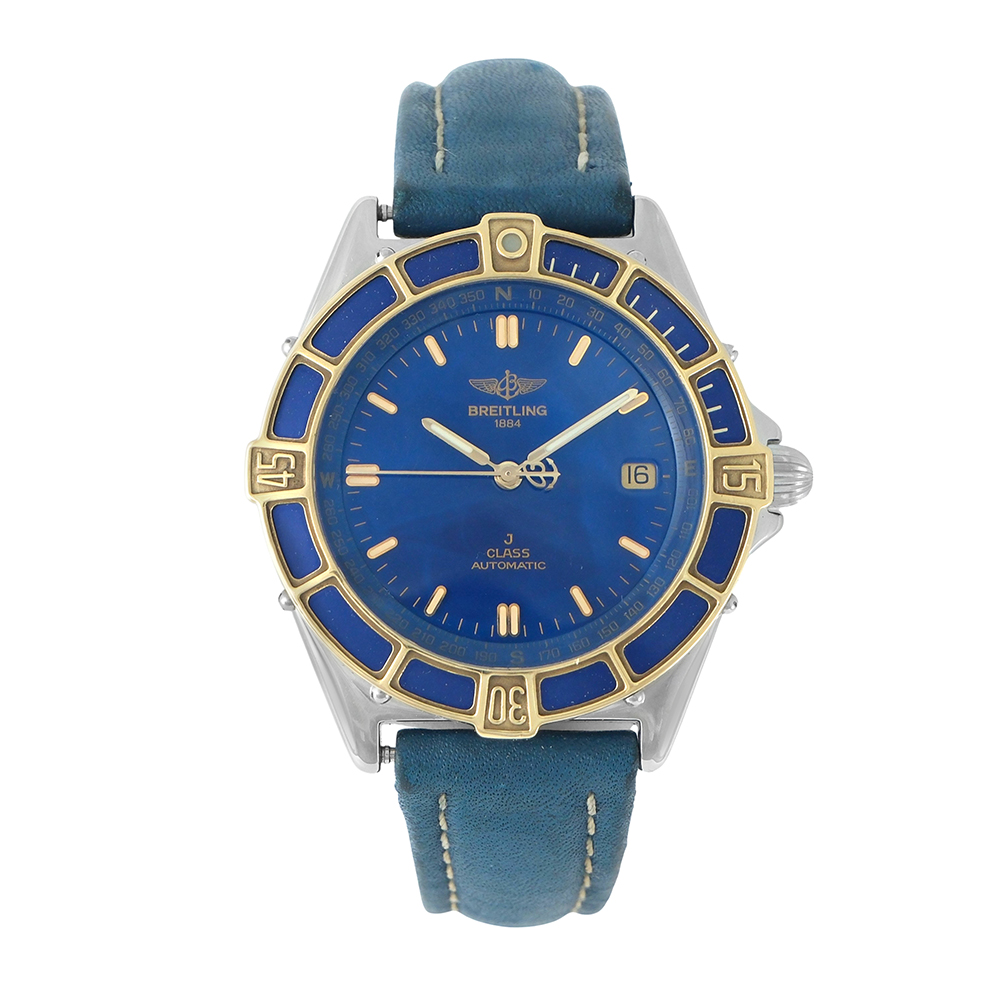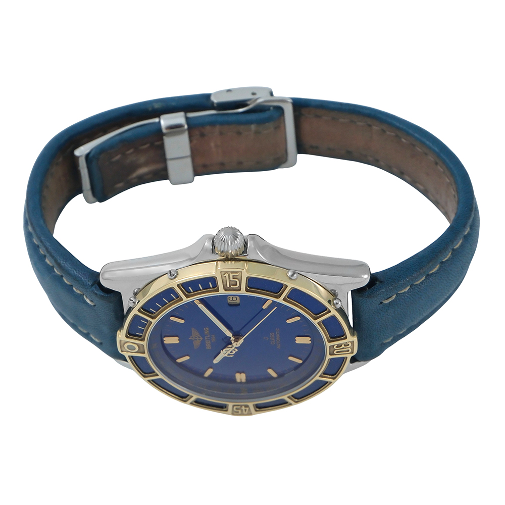 Este reloj Breitling J Class 39mm ref.-D10067 es un reloj de lujo de segunda mano, autenticado y verificado. Se entrega con estuche Carrera, sin documentación y 2 años de garantía. Año estimado del reloj 1990. Muy buen estado de conservación. Equipado con movimiento automático, caja de acero y oro de 39 mm con esfera azul y calendario, bisel giratorio unidireccional, cristal de zafiro, brazalete de piel azul con cierre hebilla ardillón y hermeticidad hasta 100 metros.