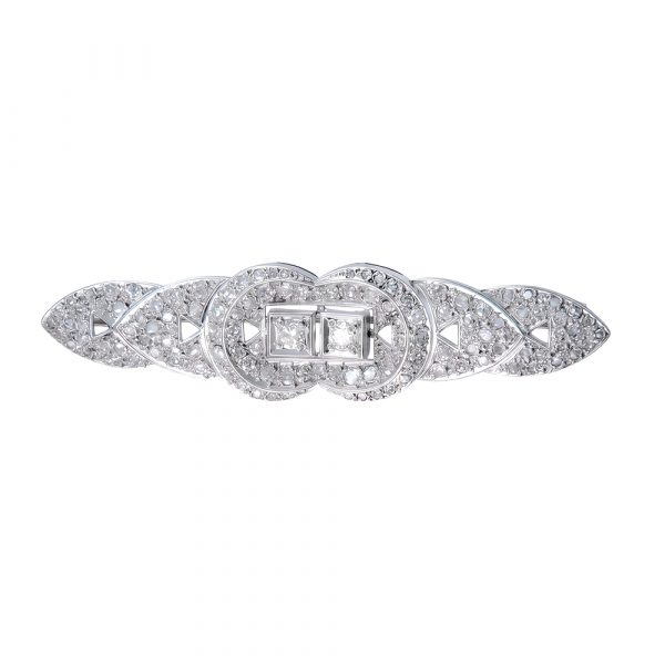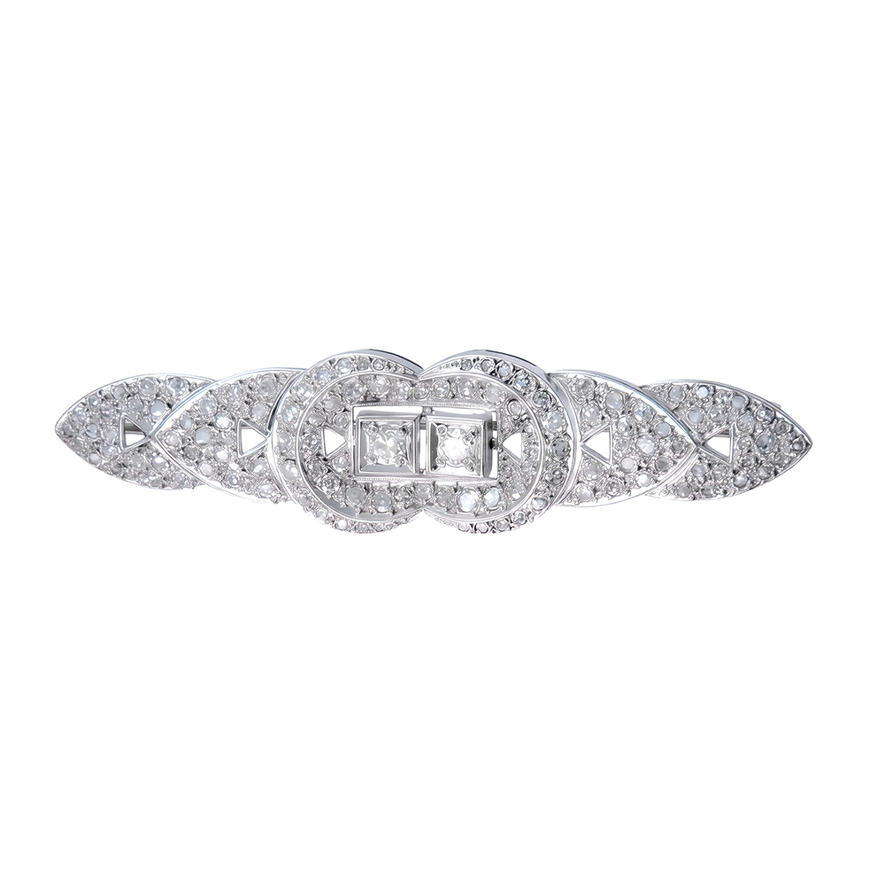 Elegante broche antiguo Art Dèco, realizado en oro blanco y engastado con diamantes, con un diseño geométrico refinado y perfectamente equilibrado. La pieza destaca por su estructura simétrica y su cuidada disposición de los diamantes, que aportan luminosidad y sofisticación sin exceso. Un atemporal diseño que refleja la estética característica de la joyería de los años 20-30, donde la precisión, la armonía y la elegancia eran esenciales.