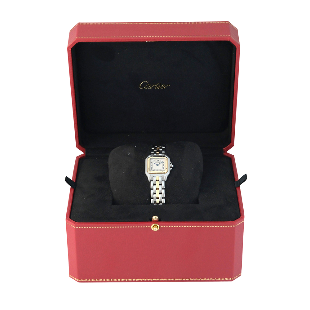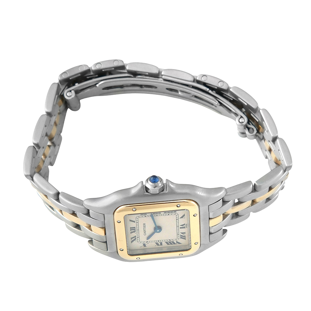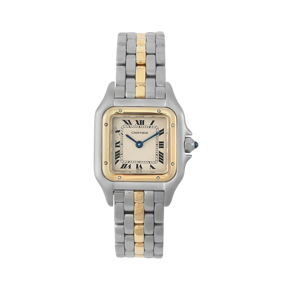 Cartier Panthere lady 22 mm Ref-112000R es un reloj de segunda mano autenticado y verificado y con 2 años de garantía. Se entrega con estuche Cartier, sin documentación. Muy buen estado. Año aproximado 1990. Dotado con movimiento de cuarzo, caja de 22mm de diámetro de acero con bisel de oro, esfera vainilla, números romanos, cristal de zafiro, agujas azuladas, cristal de zafiro, brazalete de acero y oro, cierre desplegable oculto y hermeticidad hasta 30 metros. Nuestros envíos están asegurados en todo el mundo y son gratuitos en península, garantizando una experiencia de compra 100% segura.