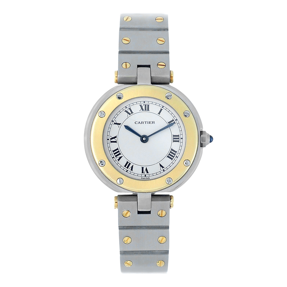 Cartier Santos Ronde 27mm ref.-81913 es un reloj de lujo de segunda mano, autenticado y verificado en buen estado de conservación (esfera con pátina natural del tiempo), sin documentación, con estuche Cartier y 2 años de garantía Carrera. Se estima del año 1995 aprox. Equipado con movimiento de cuarzo, caja redonda de acero y oro de 27×32 mm de diámetro, esfera blanca con números romanos, cristal de zafiro, agujas de acero azulado, corona con zafiro cabujón, bisel de oro amarillo 18kt, brazalete de acero y oro con cierre desplegable.