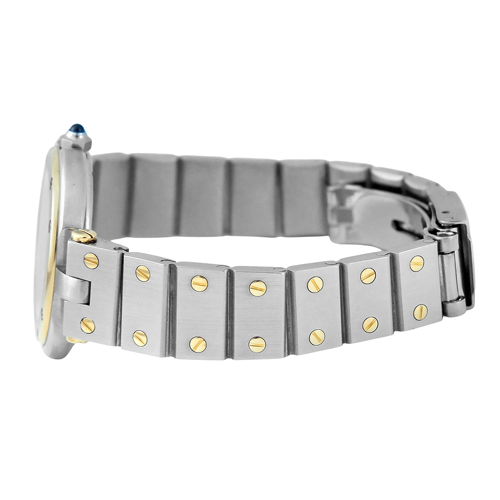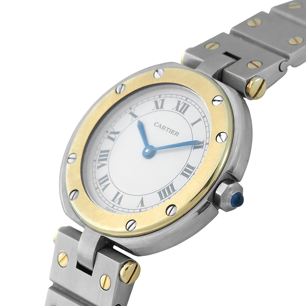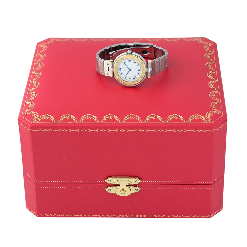 Este Cartier Santos Ronde 27mm ref.-81913 es un reloj de lujo de segunda mano, autenticado y verificado en buen estado de conservación (esfera con pátina natural del tiempo), sin documentación, con estuche Cartier y 2 años de garantía Carrera. Se estima del año 1995 aprox. Equipado con movimiento de cuarzo, caja redonda de acero y oro de 27×32 mm de diámetro, cristal de zafiro, esfera blanca con números romanos, agujas de acero azulado, corona con zafiro cabujón, bisel de oro amarillo 18kt, brazalete de acero y oro con cierre despegable.