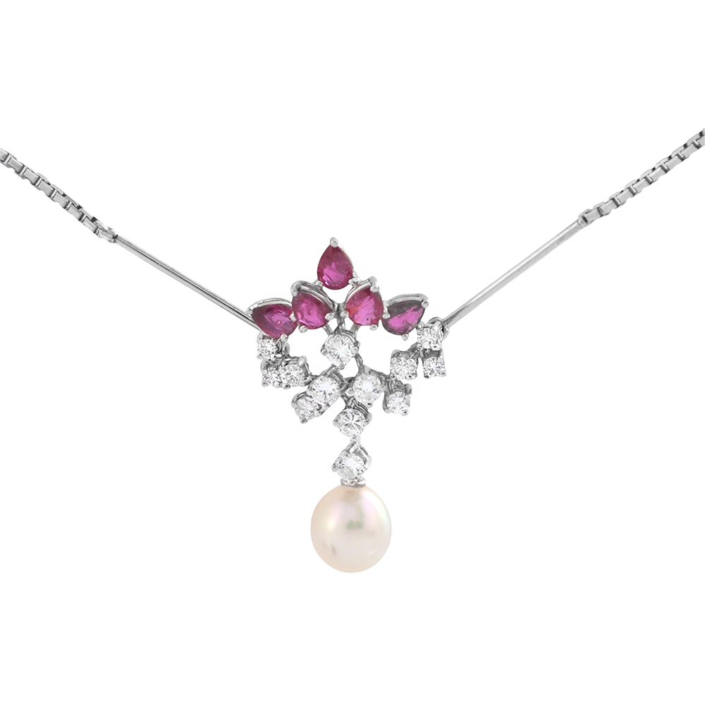 Elegante joya de ocasión artesanal años 60 con este exclusivo collar sobre montura de oro blanco, con engaste de diamantes talla brillante (0.70ct), rubíes talla marquise (0.75ct) y perla cultivada Cadena veneciana con cierre de barril. Envíos gratuitos asegurados en todo el mundo.