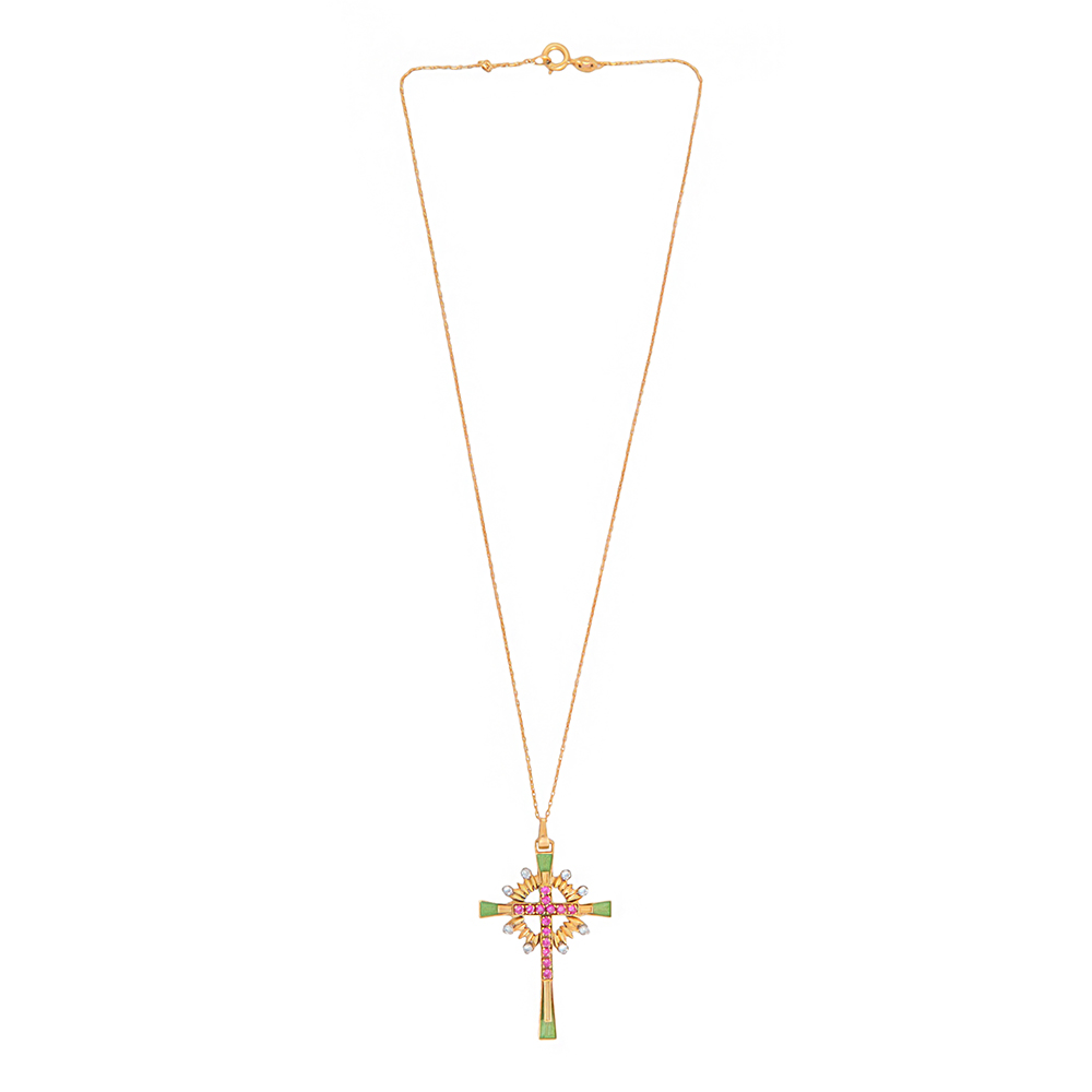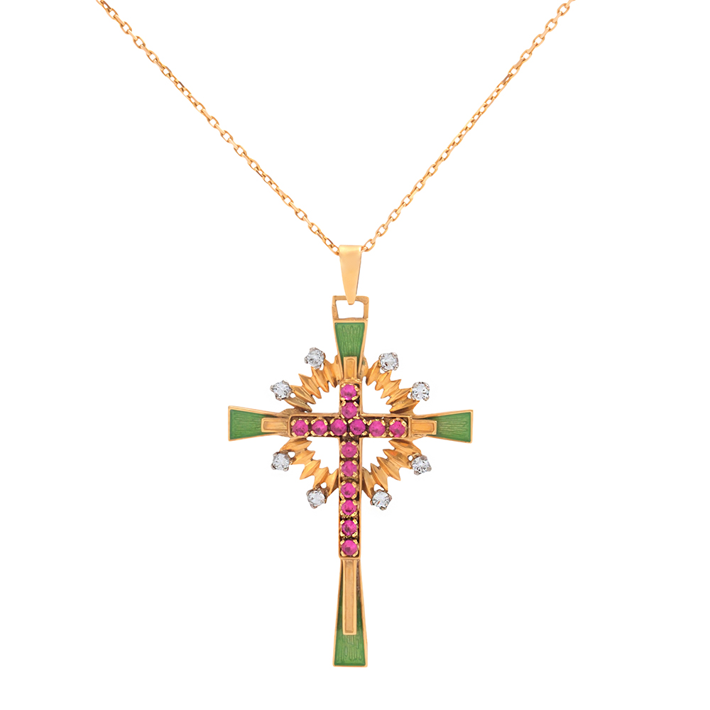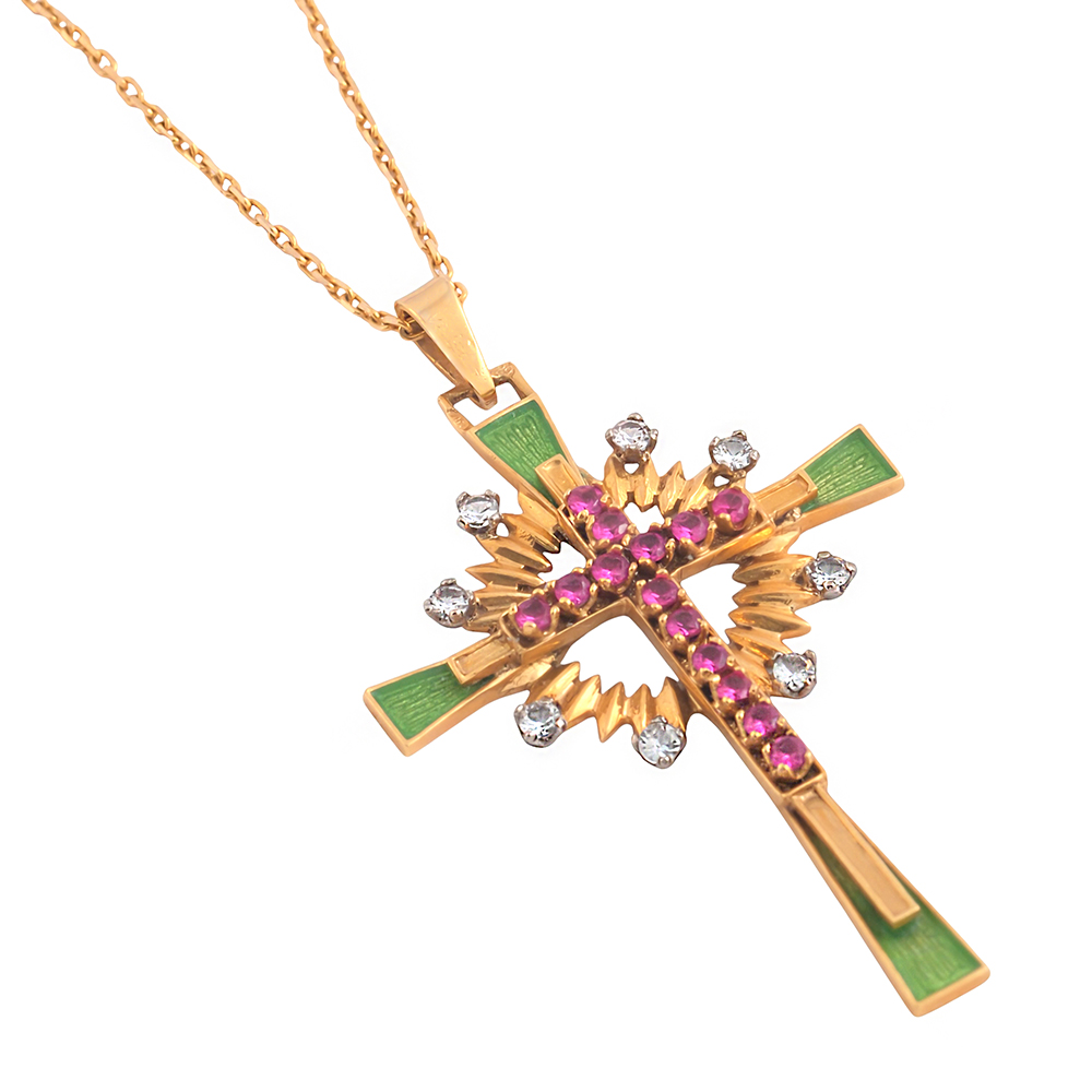 Esta cruz vintage años 30 presenta un llamativo y elegante diseño que mezcla varios elementos característicos: oro amarillo 18 quilates, acabado en verde esmaltado y piedras preciosas como rubíes y diamantes. La disposición geométrica de los elementos y el uso de colores, reflejan el interés por la combinación de tonos llamativos típica de la época. Las cruces de este estilo a menudo se usaban no solo como símbolos religiosos, sino también como piezas de moda en el periodo vintage, especialmente entre los años 30 y 50.
