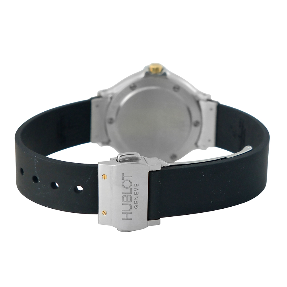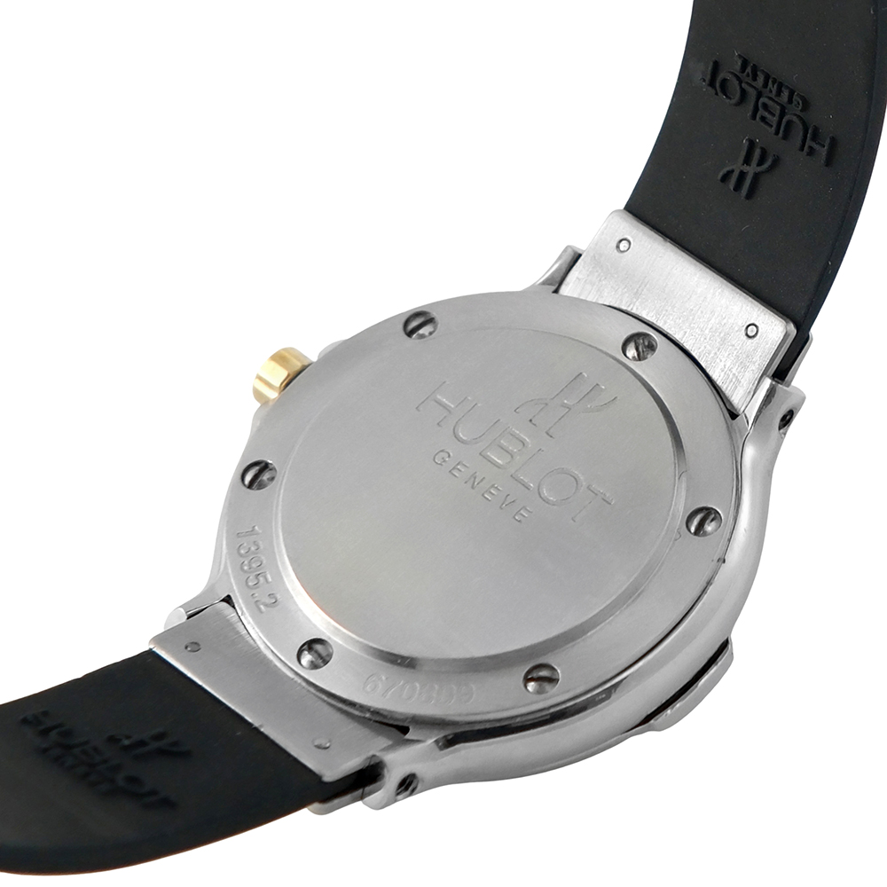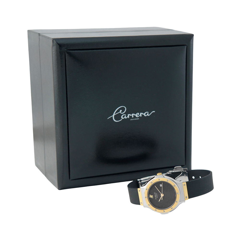 Este reloj Hublot Classic 28 mm Ref.-1395.2 es un reloj de lujo de segunda mano, autenticado y verificado con 2 años de garantía, sin estuche ni documentación. Excelente estado de conservación. Año aprox. 2010. Equipado con movimiento de cuarzo, esfera negra con calendario, bisel de oro amarillo con tornillos anclados, caja de acero y oro de 28 mm de diámetro, brazalete de caucho con cierre plegable doble de acero y hermeticidad hasta 50 metros (soporta solo pequeñas salpicaduras). Las correas del brazalete se han sustituido por unas nuevas y el contorno total de muñeca es de hasta 165mm incluida la esfera.
