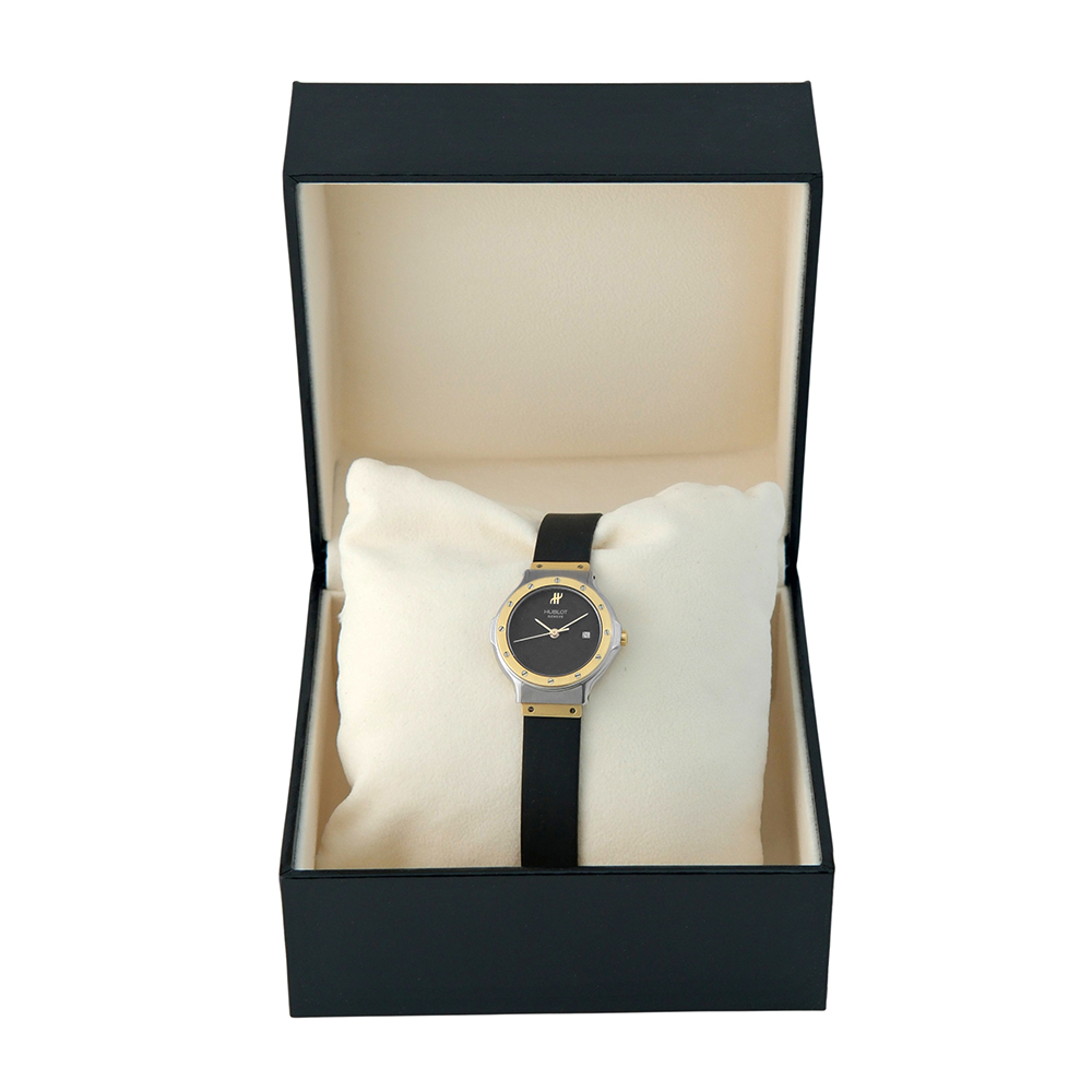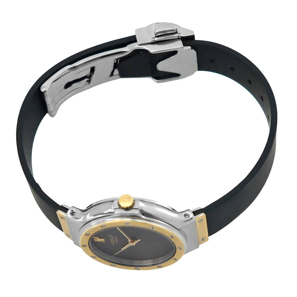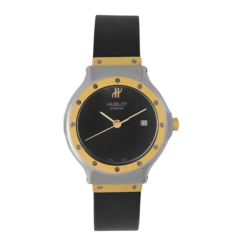 Hublot Classic 28 mm Ref.-1395.2 es un reloj de lujo de segunda mano, autenticado y verificado con 2 años de garantía, sin estuche ni documentación. Excelente estado de conservación. Año aprox. 2010. Equipado con movimiento de cuarzo, esfera negra con calendario, bisel de oro amarillo, brazalete de caucho con cierre plegable doble de acero y hermeticidad hasta 50 metros. Envíos gratuitos en península y asegurados en todo el mundo.