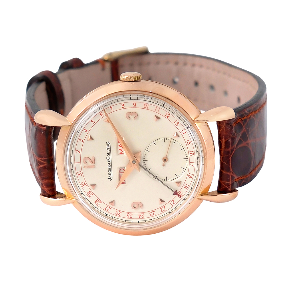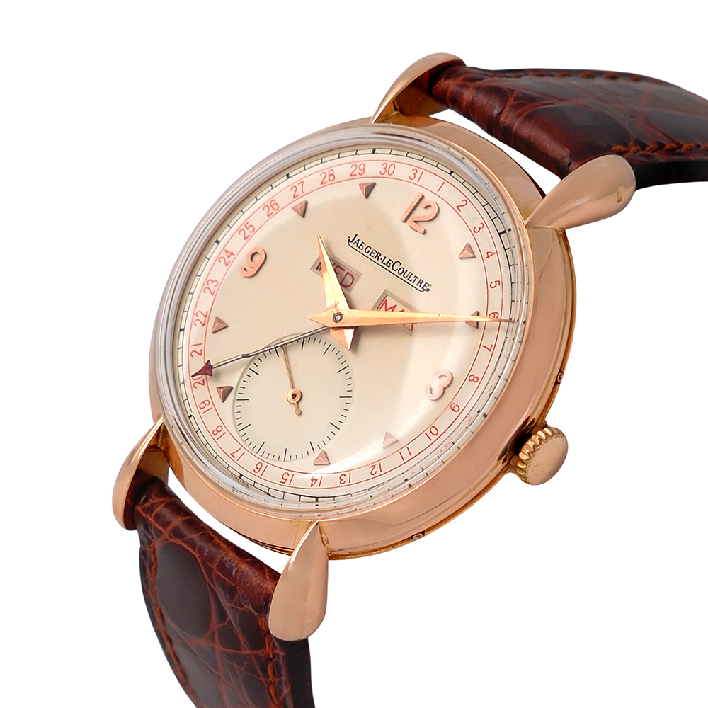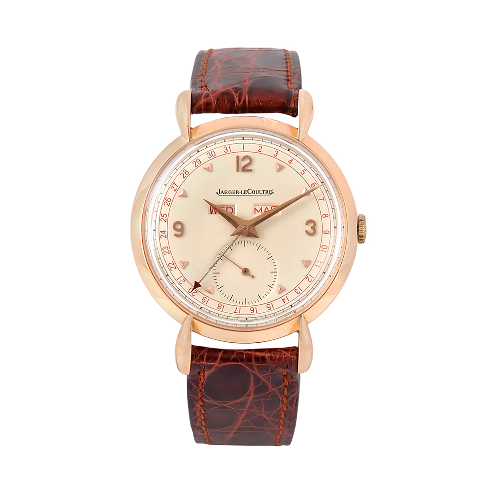 Jaeger Le Coultre Triple Calendar 34mm Ref.-2721 es un modelo que nos lleva a finales de los años 40 y principios de los 50, una época en que la firma relojera consolidaba su reputación como manufactura. Después de la Segunda Guerra Mundial, surgió una clara demanda de relojes con más complicaciones, pero sin perder elegancia y llevables a diario. Entonces es cuando aparecen los triple calendario, que ofrecían fecha, día y mes pero sin llegar a la complejidad de un calendario perpetuo.