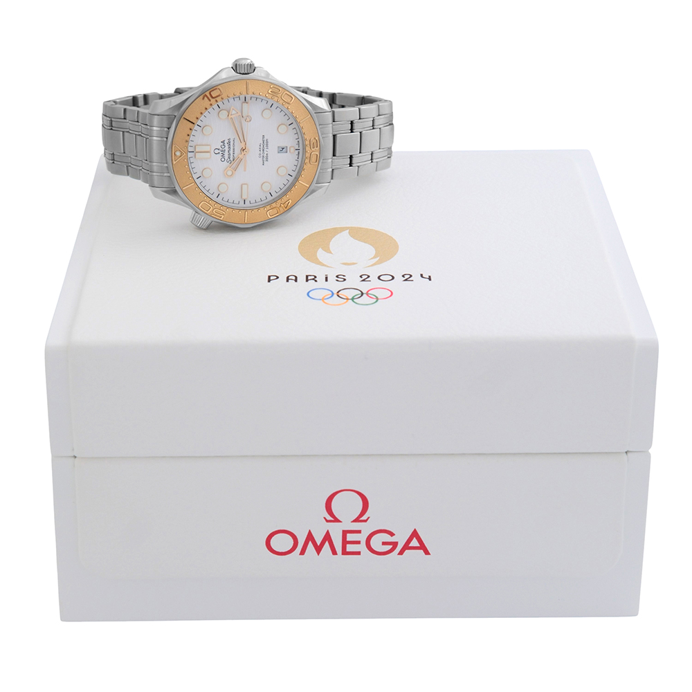 Este reloj es una edición especial no limitada exclusiva en boutiques Omega de Paris, creada por la casa relojera para celebrar su rol como Cronometrador Oficial de los JJ.OO París 2024, continuando con una tradición que empezó en el año 1932. Esta edición fue lanzada en los años 2023-2024 y presenta un estuche temático olímpico. Combina fiabilidad y diseño icónico de la linea Diver 300m, con un toque olímpico en oro Moonshine y exclusivos detalles. Su sistema «quick change» facilita cambiar su brazalete de acero por otro de caucho sin herramientas. Es una pieza de coleccionista para amantes de los deportes y de Omega, respaldada por Master Chronometer.