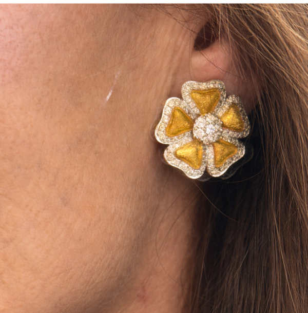 Exclusivos pendientes de diseño floral elaborados en oro amarillo, realzados con diamantes que enmarcan cada pétalo y aportan luminosidad sofisticada. El centro, también engastado con diamantes, refuerza la sensación de flor abierta y equilibrada.