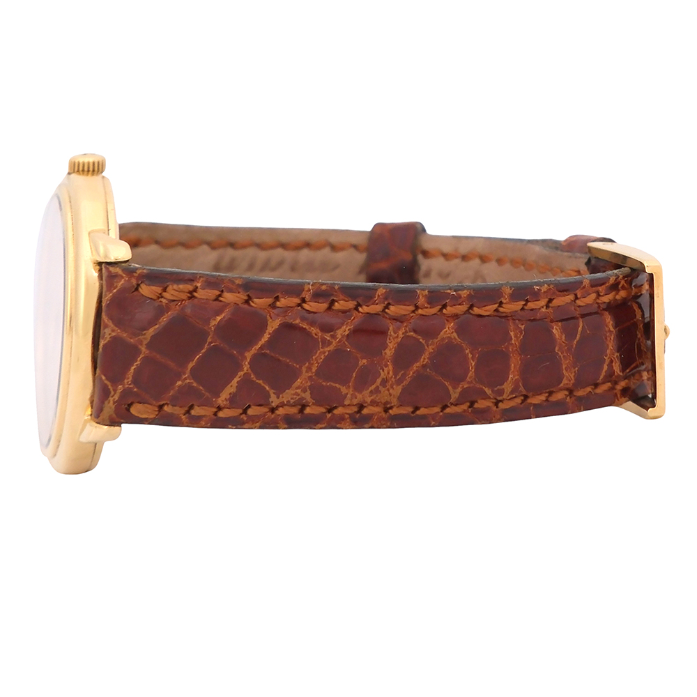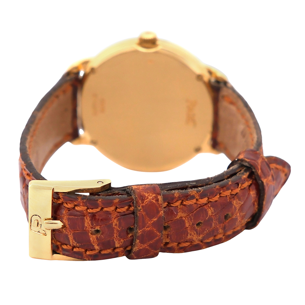 Este reloj Piaget oro 18kt 28mm ref.-9968, es un reloj de segunda mano autenticado y verificado cn 2 años de garantía, estuche Carrera, sin documentación en excelente estado de conservación. Año aprox 1998. Equipado con movimiento de cuarzo, esfera plata con números romanos, bisel de oro amarillo 18kt, brazalete de piel marrón y hebilla ardillón. Este reloj no es hermético por lo que no se puede mojar.