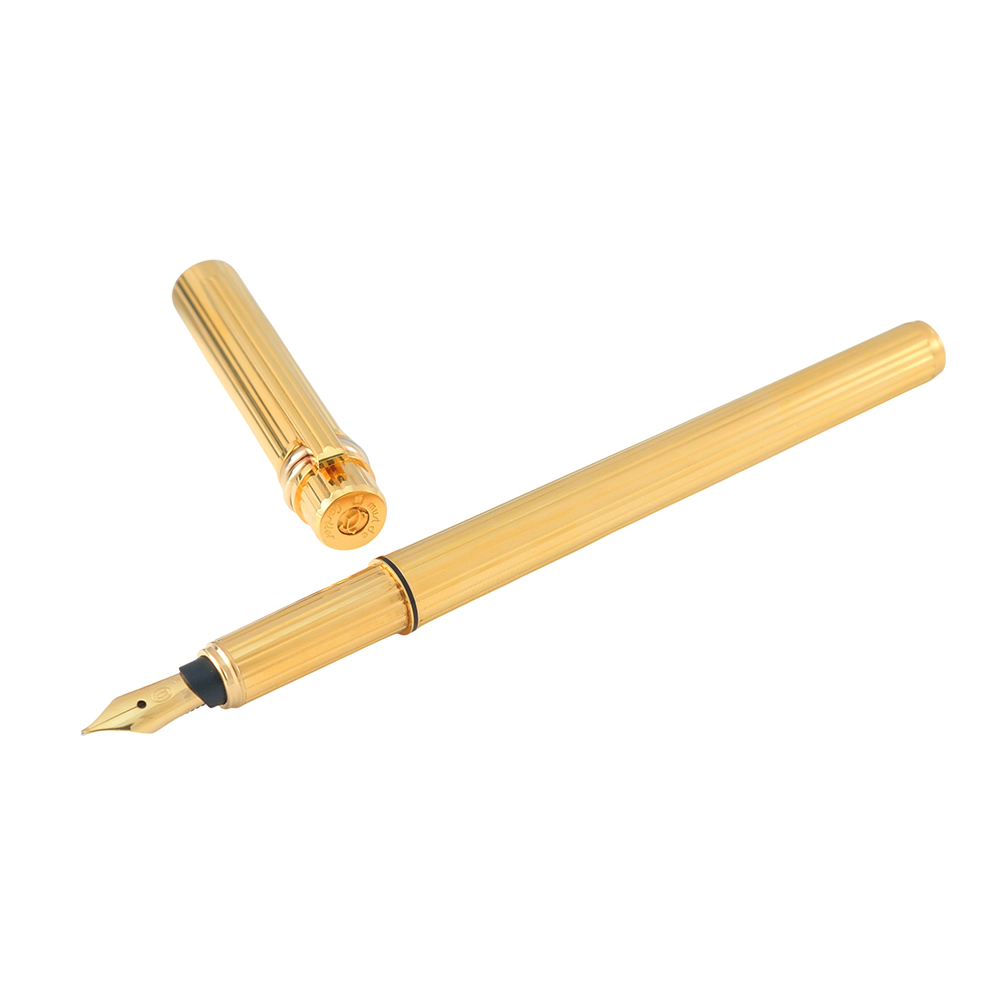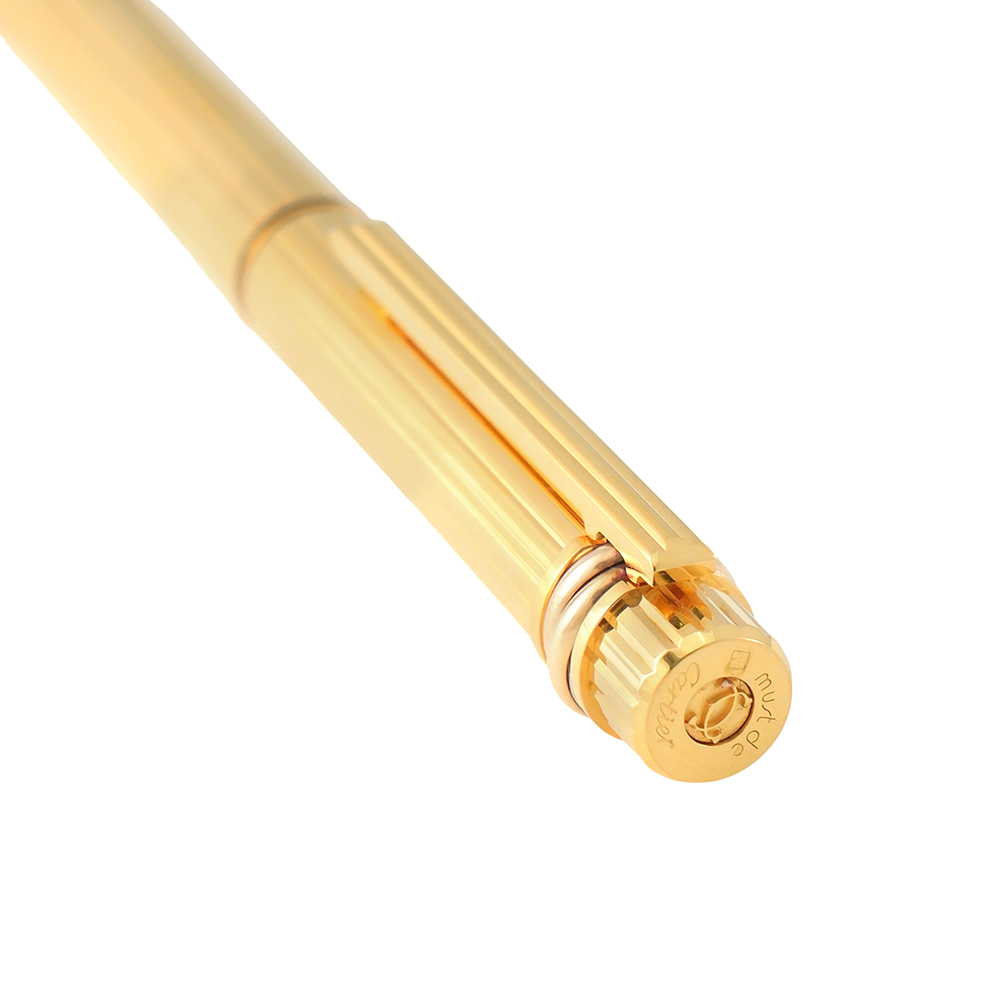Pluma Trinity de Cartier es un artículo de escritura de lujo de segunda mano, autenticado y verificado, en excelente estado de conservación. Se entrega con estuche Cartier, sin documentación. Elaborada en oro amarillo con acabados de lujo y sistema de escritura estilográfica con plumín de oro amarillo de 18kt.