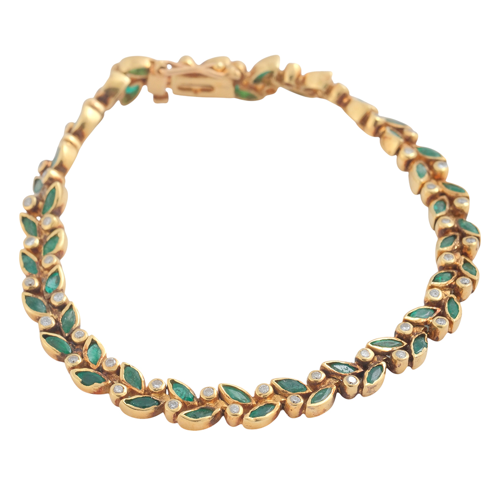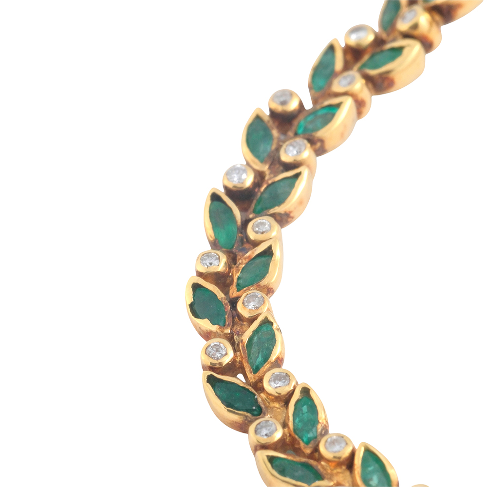 Pulsera vintage años 80 sobre montura de oro amarillo de 18 kt con original diseño de hojas engastadas con esmeraldas marquise con peso total 5.10 cts y pequeños diamantes talla brillante con peso total 1.02 ct intercalados. Un diseño típico de la alta joyería de la época.