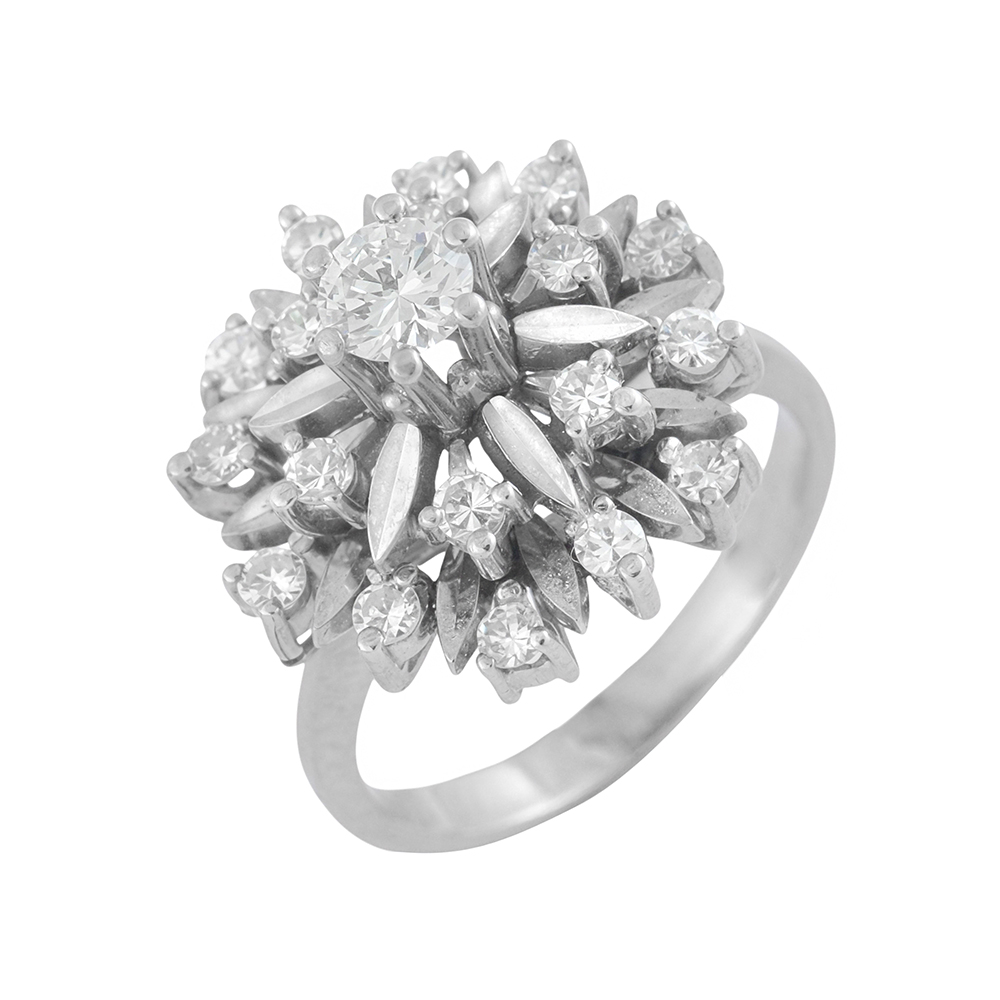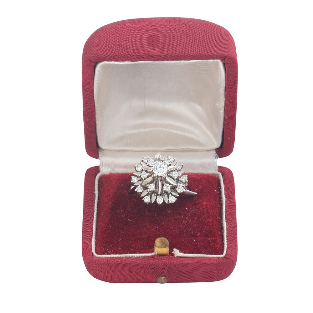 Sortija años 60 modelo roseta, es una deslumbrante pieza con alma de joyero clásico. De diseño tridimensional, con diamante central elevado en garras (10.40ct) y rodeado por un halo de diamantes talla antigua, cuidadosamente engastados en forma de pétalos, con peso total de 0.72ct. Es una joya de ocasión que ha sido restaurada. Excelente estado de conservación. Envíos gratuitos.