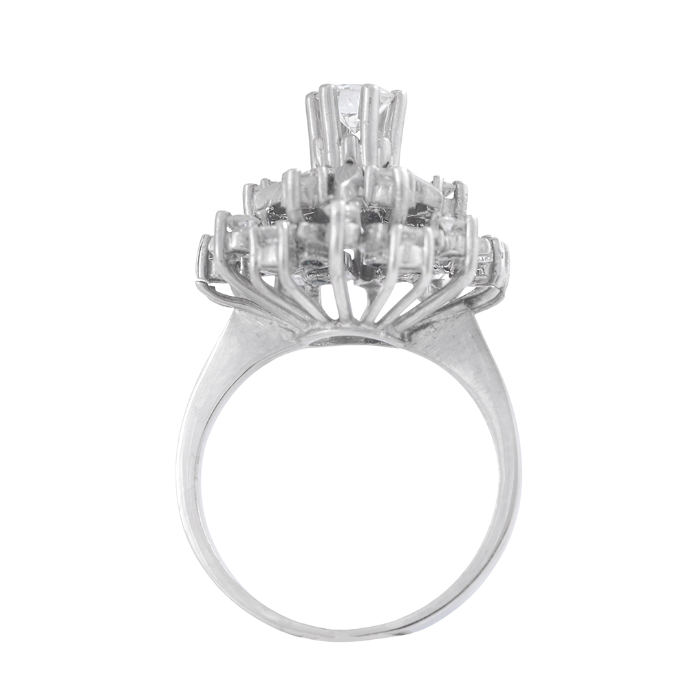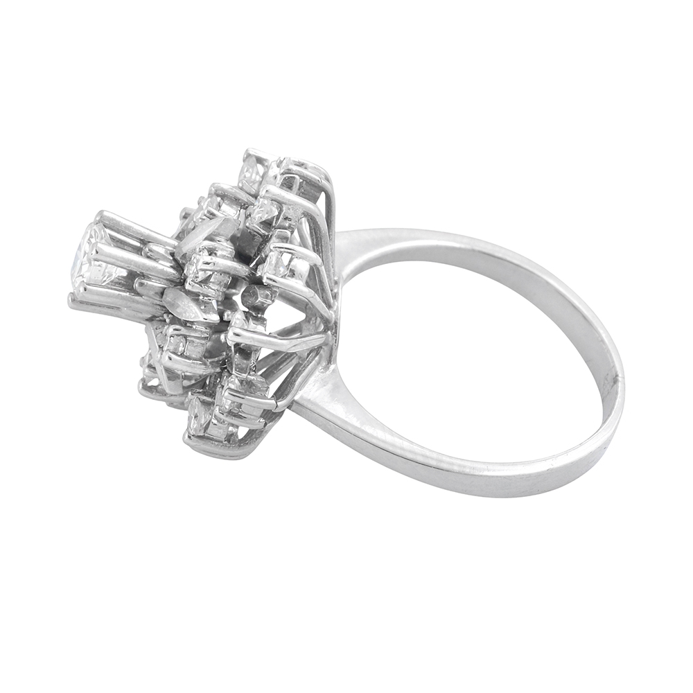 Sortija años 60 modelo roseta, es una deslumbrante pieza con alma de joyero clásico. De diseño tridimensional, con diamante central elevado en garras (10.40ct) y rodeado por un halo de diamantes talla antigua, cuidadosamente engastados en forma de pétalos, con peso total de 0.72ct.