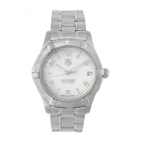 Este TAG Heuer Aquaracer 32 mm Ref.-WAF1311 es un reloj de segunda mano autenticado y verificado, con 2 años de garantía. Se entrega con estuche Carrera, sin documentación. Año aprox. 2011. Excelente estado de conservación. Dotado de movimiento de cuarzo, bisel de acero giratorio unidireccional, cristal de zafiro, esfera madreperla, calendario, brazalete de acero (contorno total 185 mm incluida la esfera), cierre desplegable y hermeticidad hasta 300 metros.