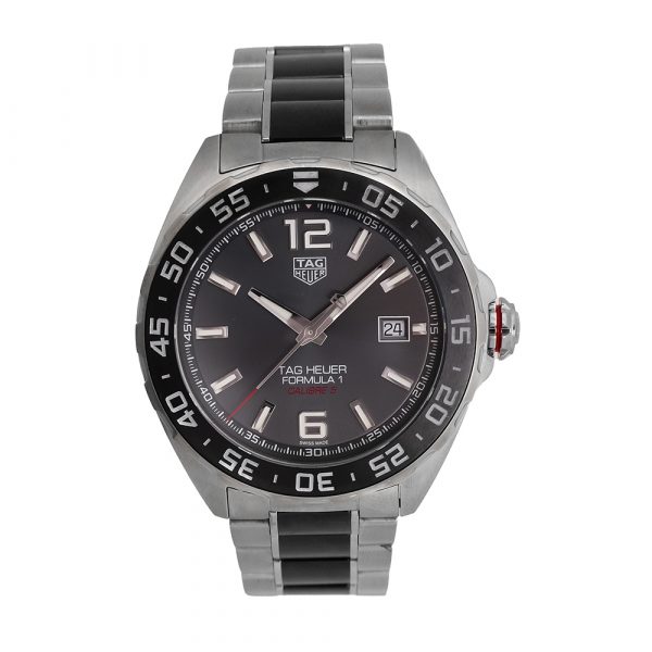 TAG Heuer Formula 1 43mm Ref.WAZ2011 es un reloj de segunda mano autenticado y verificado con 2 años de garantía, estuche Carrera, sin documentación. Año 2021. Excelente estado de conservación. Equipado con movimiento automático calibre 5, esfera gris con calendario, bisel de cerámica, caja de acero de 43mm de diámetro, cristal de zafiro, brazalete combinado acero-cerámica y cierre desplegable. Es hermético hasta 200 metros.