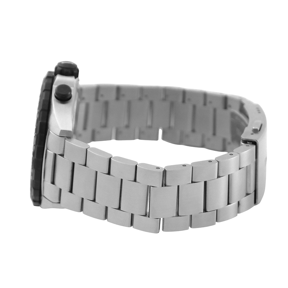 Equipado con movimiento de cuarzo, caja de 43mm de acero, bisel giratorio unidireccional, cronógrafo, fecha, esfera negra con subesferas, bisel de acero recubierto de carburo de titanio negro, cristal de zafiro, brazalete de acero con cierre desplegable, hermeticidad hasta 200 metros, corona atornillada, fondo de acero roscado y manecillas e índices luminiscentes.