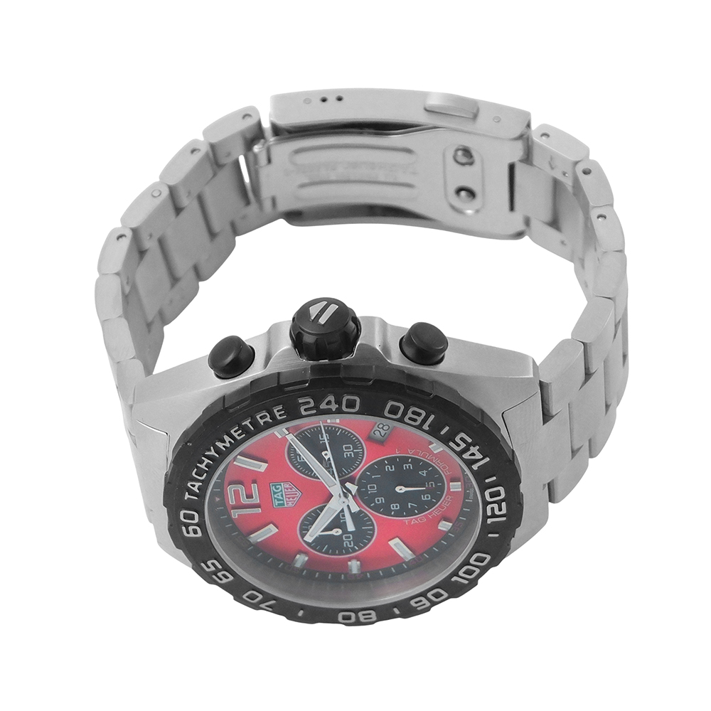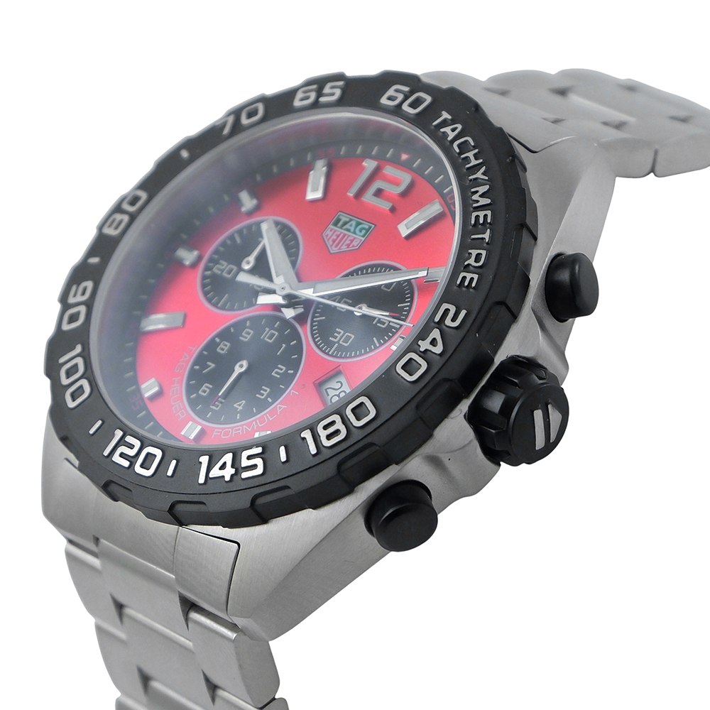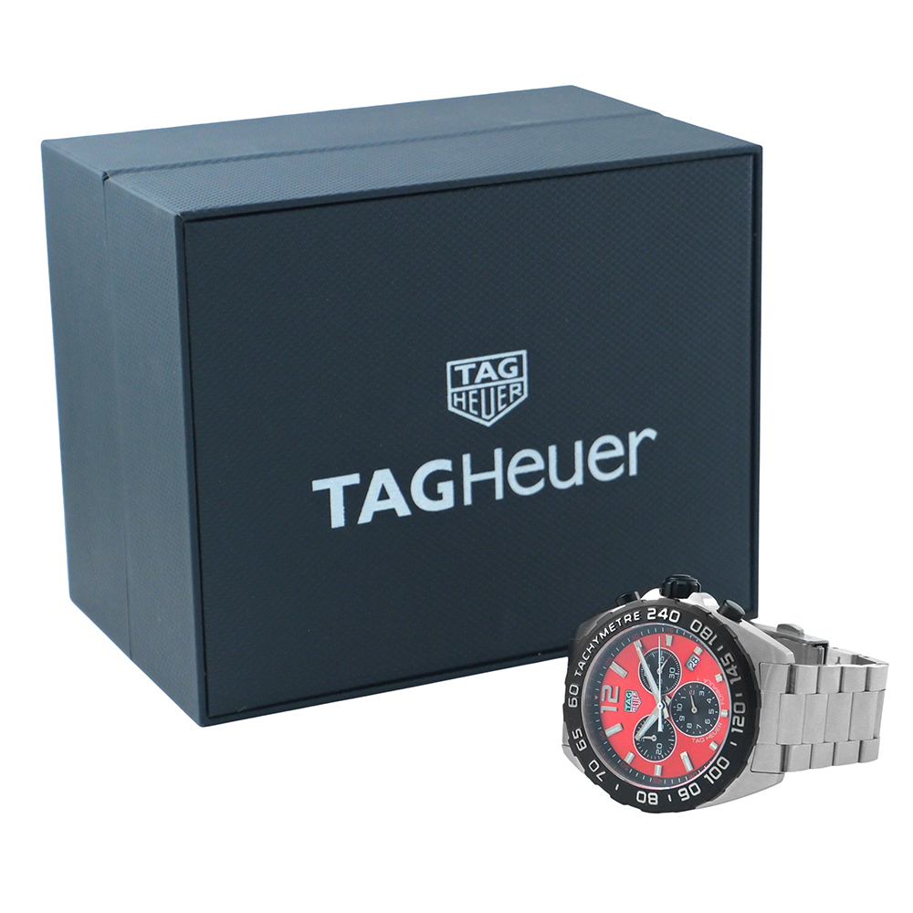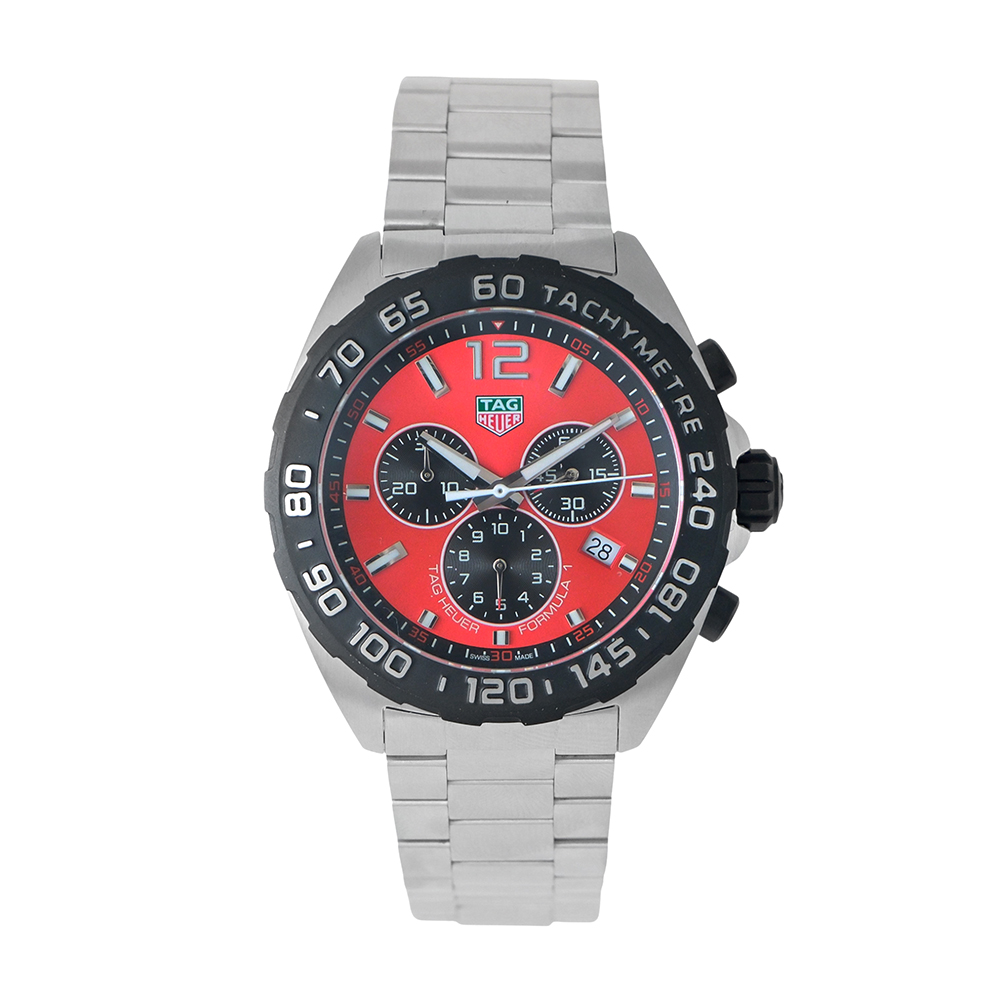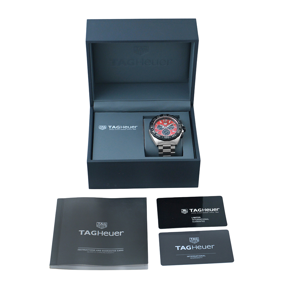 Este TAG Heuer Fórmula 1 Chornograph 43mm Ref.-CAZ101AN.BA0842 es un reloj de lujo autenticado y verificado, de segunda mano con 2 años de garantía, estuche Tag Heuer y documentación. Año aproximado 2024. Muy buen estado de conservación. Equipado con movimiento de cuarzo, bisel giratorio unidireccional, cronógrafo, fecha, esfera roja con subesferas, bisel de acero recubierto de carburo de titanio negro, cristal de zafiro, brazalete de acero con cierre desplegable, hermeticidad hasta 200 metros, corona atornillada, fondo de acero roscado y manecillas e índices luminiscentes. Envíos gratuitos en península y asegurados en todo el mundo.