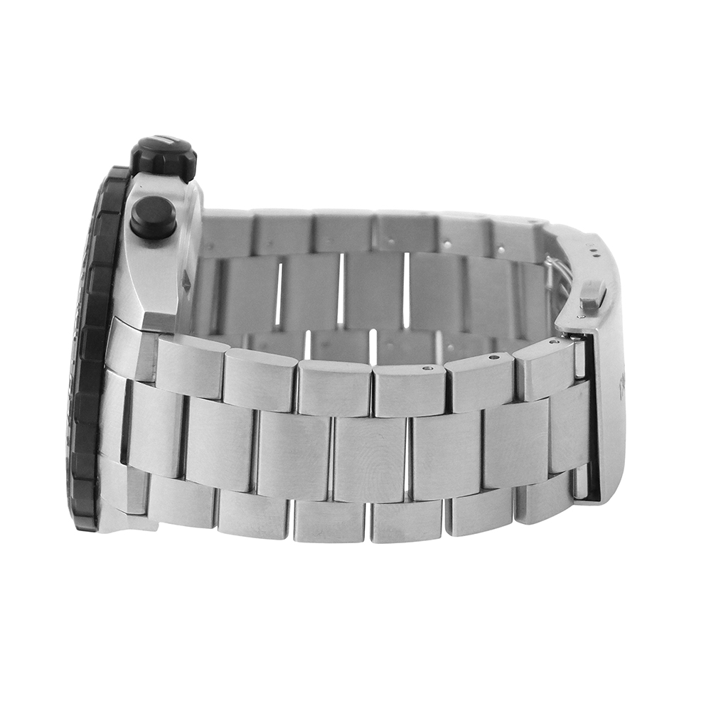 Equipado con movimiento de cuarzo, caja de 43 mm de acero, bisel giratorio unidireccional, cronógrafo, fecha, esfera roja con subesferas, bisel de acero recubierto de carburo de titanio negro, cristal de zafiro, brazalete de acero con cierre desplegable, hermeticidad hasta 200 metros, corona atornillada, fondo de acero roscado y manecillas e índices luminiscentes.