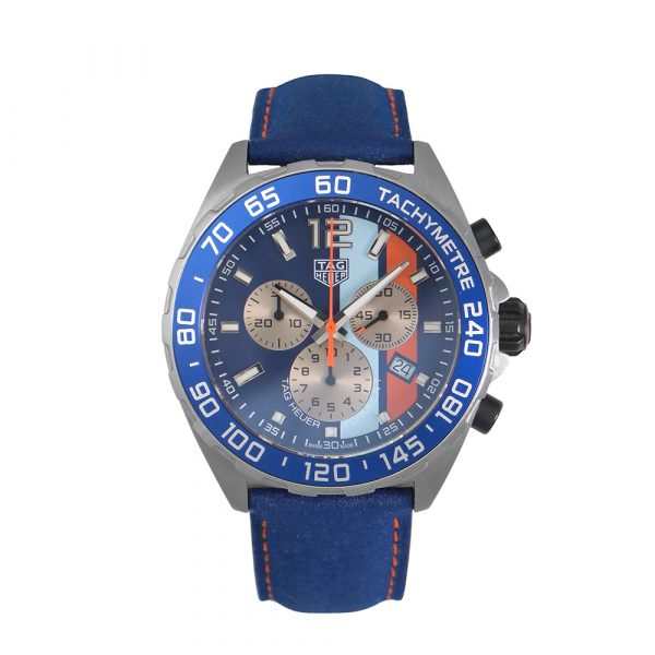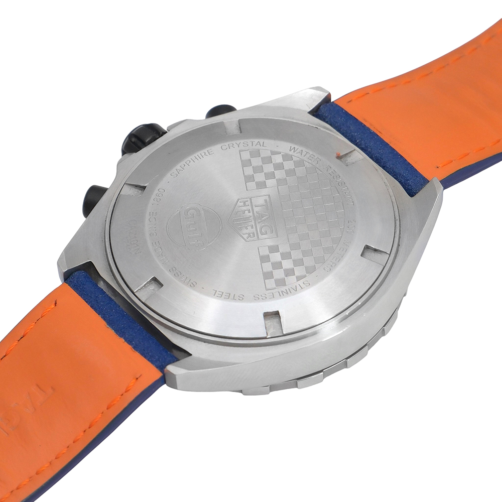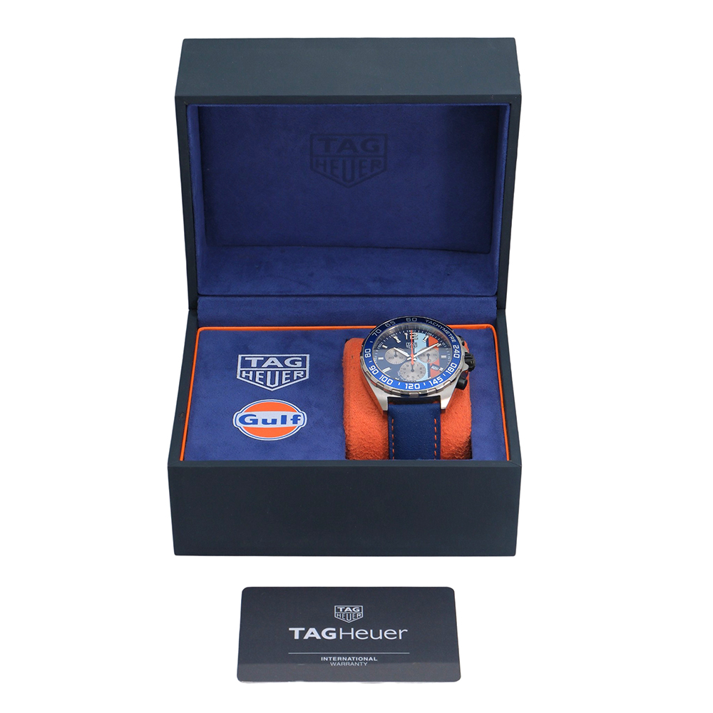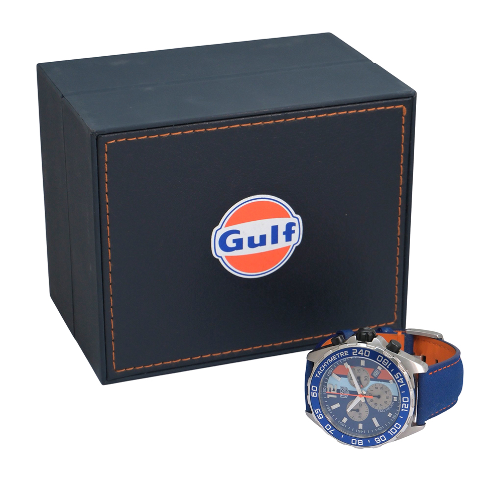 Tag Heuer tiene una fuerte vinculación con el mundo automovilístico y los cronógrafos deportivos. La colección Fórmula 1 surge como línea deportiva accesible rindiendo homenaje a la velocidad; el elemento Gulf de este modelo se refiere a la colaboración con la marca Gulf (famosa por sus colores naranja-azu) como el coche del film Le Mans de Steve McQueen en 1971, y las franjas de color hacen alusión a ese legado. Una edición especial de la serie Fórmula 1 con temática Gulf, con un gran atractivo temático para los coleccionistas de relojería de automovilismo.