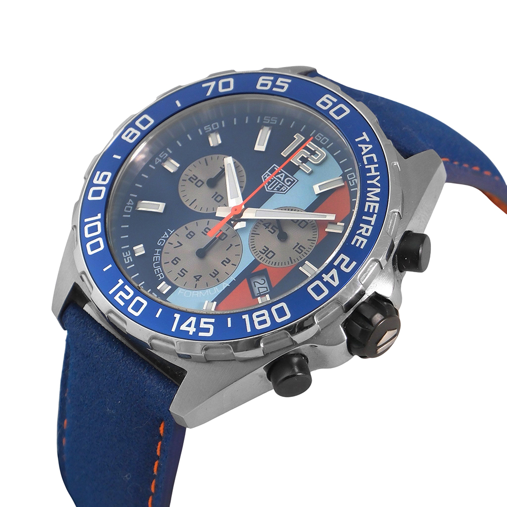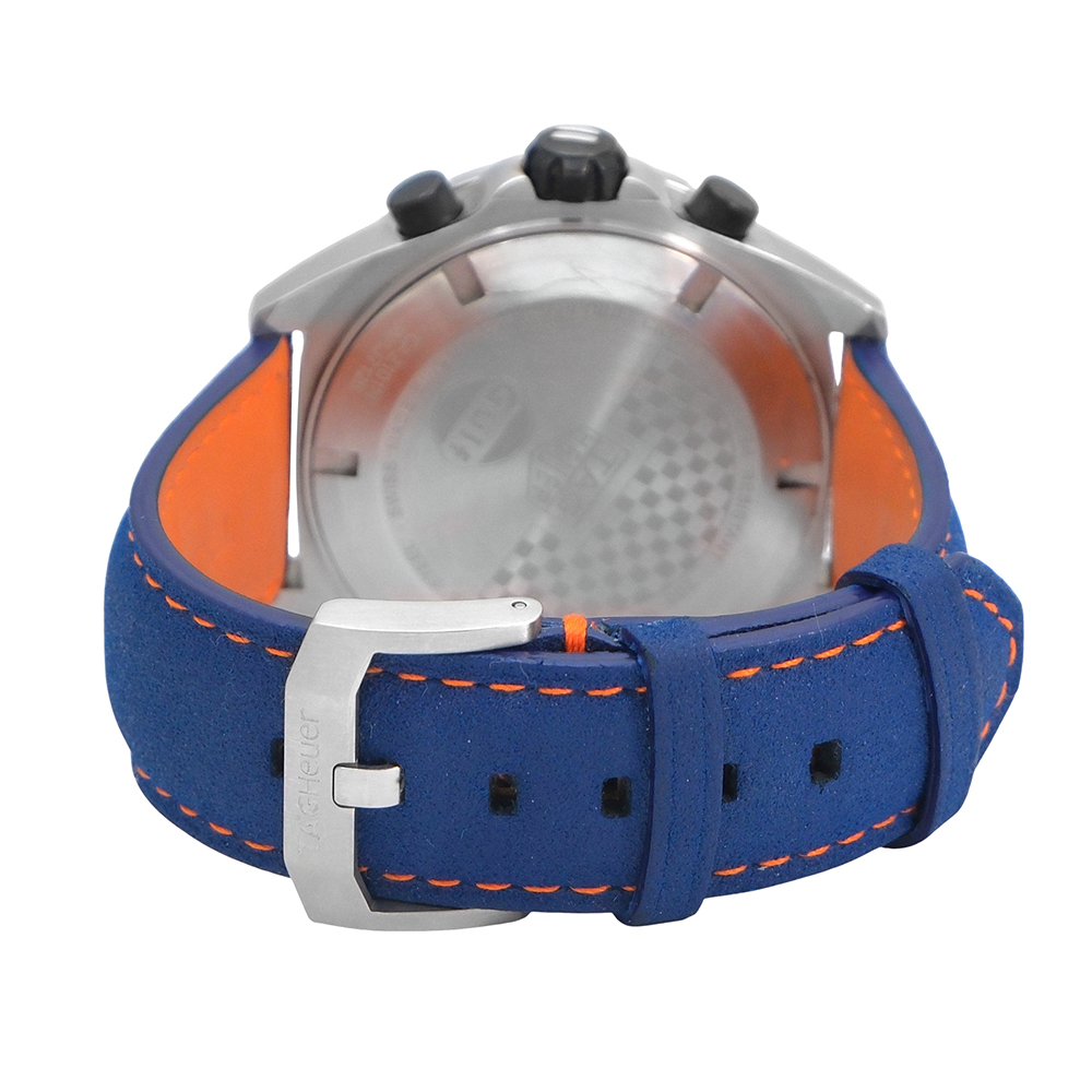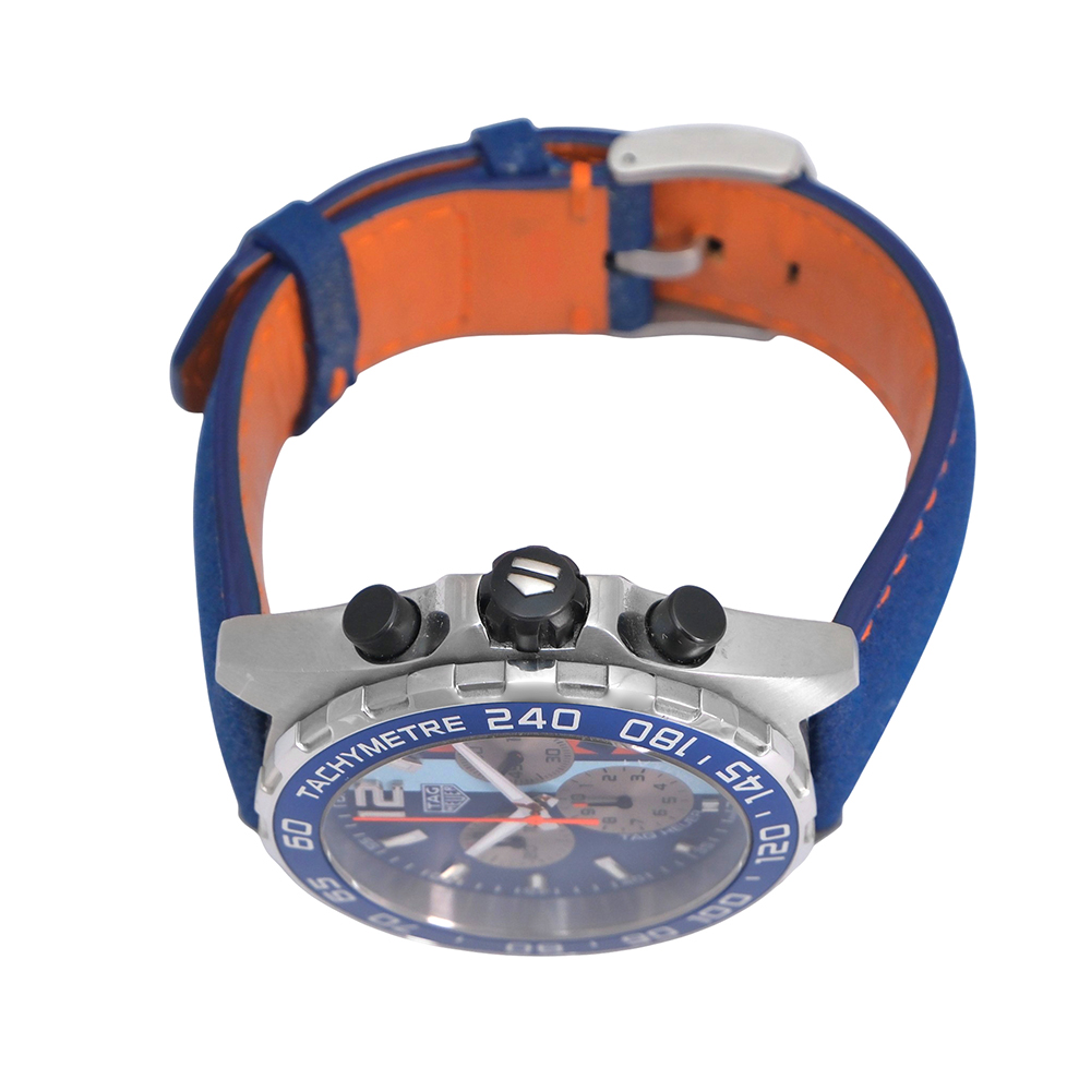 TAG Heuer Fórmula 1 Gulf 43mm Ref.-CAZ101N es un reloj de segunda mano autenticado y verificado con 2 años de garantía, estuche Tag Heuer y documentación. Año 2021. Muy buen estado de conservación pero con algunos arañazos visibles en la tapa de fondo que no se han pulido para preservar intacta su numeración y grabados de la marca. Equipado con movimiento de cuarzo, función cronógrafo y taquímetro, esfera azul con calendario y números árabes, luminiscencia, bisel giratorio unidireccional, caja de acero, cristal de zafiro, brazalete de acero con cierre desplegable y hermeticidad hasta 200 metros. Es una edición especial con grabado en la tapa trasera del logotipo Gulf.