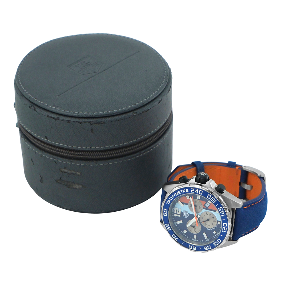 Tag Heuer tiene una fuerte vinculación con el mundo automovilístico y los cronógrafos deportivos. La colección Fórmula 1 surge como línea deportiva accesible rindiendo homenaje a la velocidad; el elemento Gulf de este modelo se refiere a la colaboración con la marca Gulf (famosa por sus colores naranja-azul) como el coche del film Le Mans de Steve McQueen en 1971, y las franjas de color hacen alusión a ese legado. Una edición especial de la serie Fórmula 1 con temática Gulf, con un gran atractivo temático para los coleccionistas de relojería de automovilismo.
