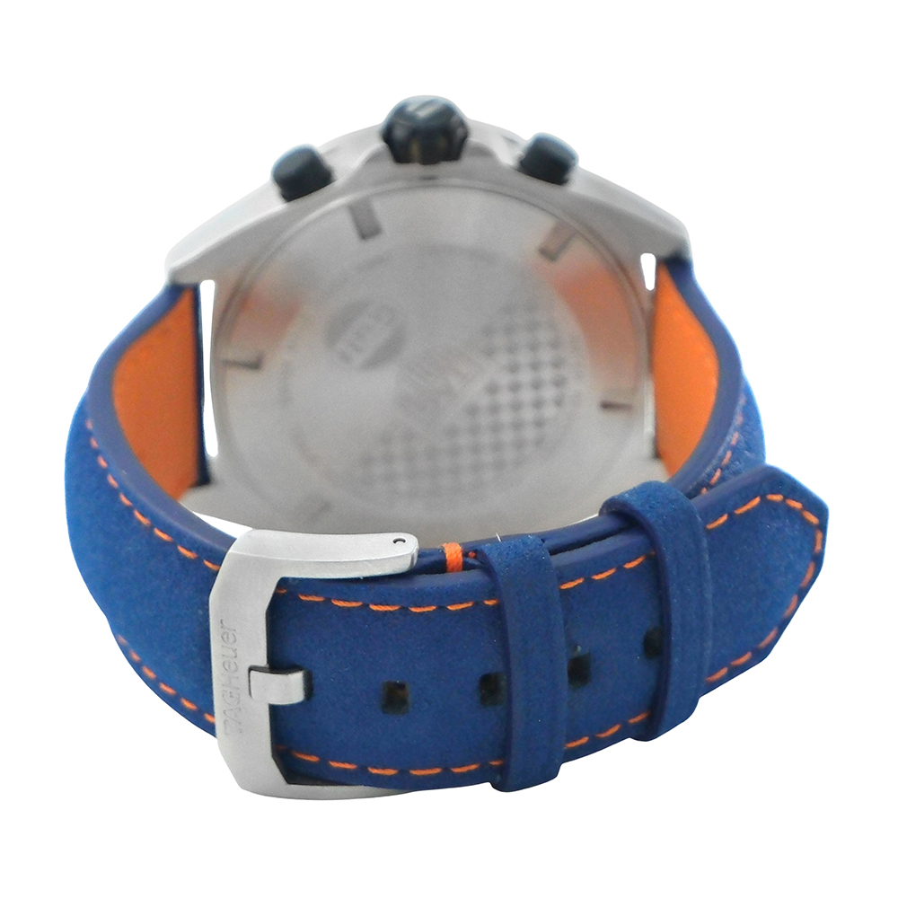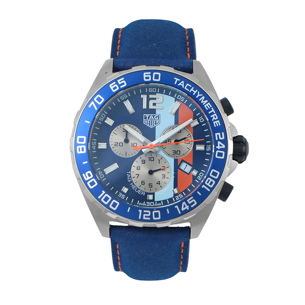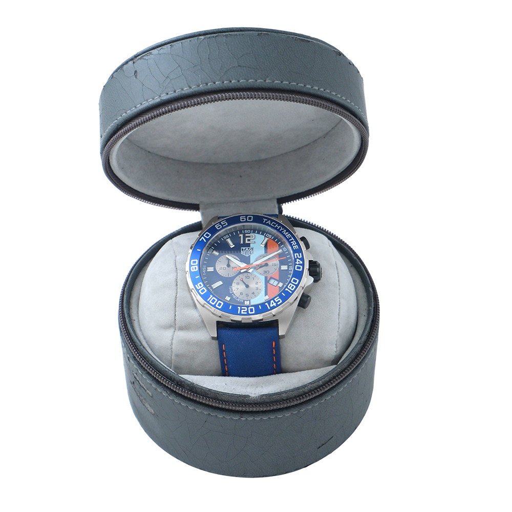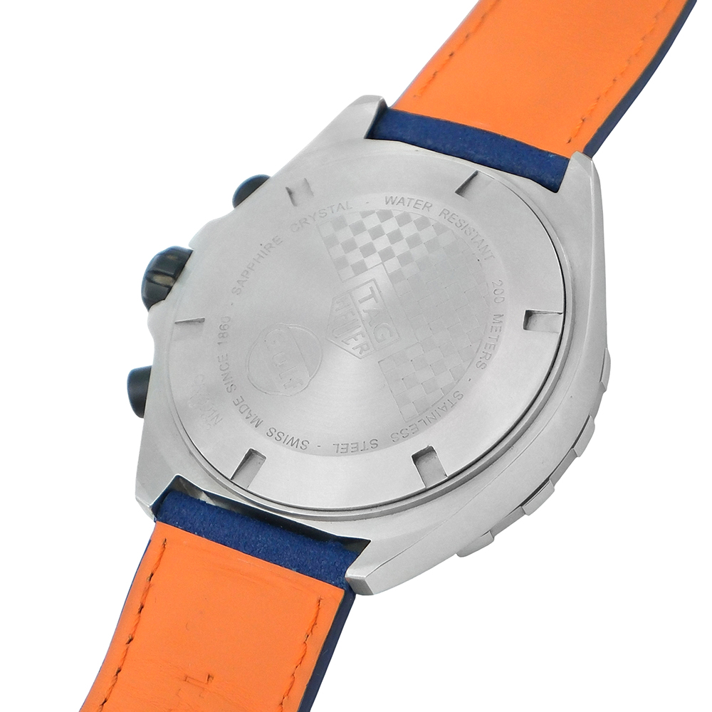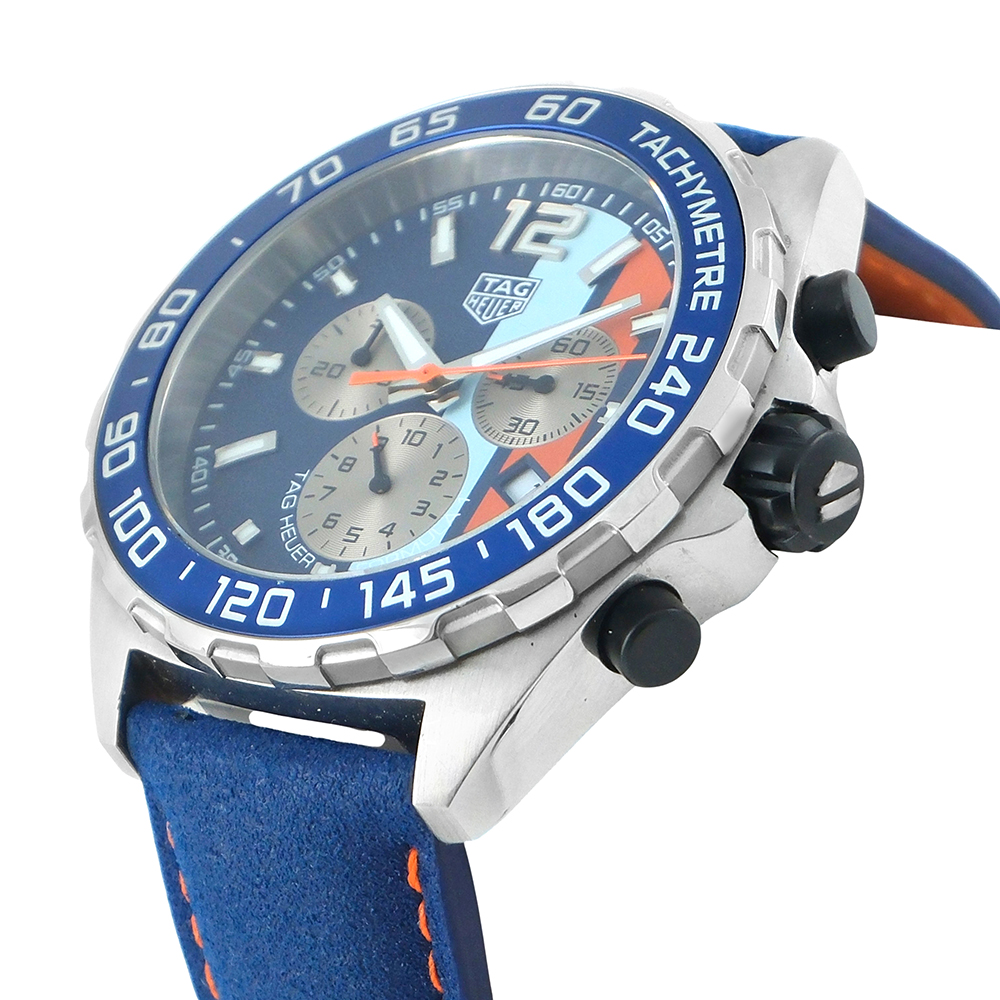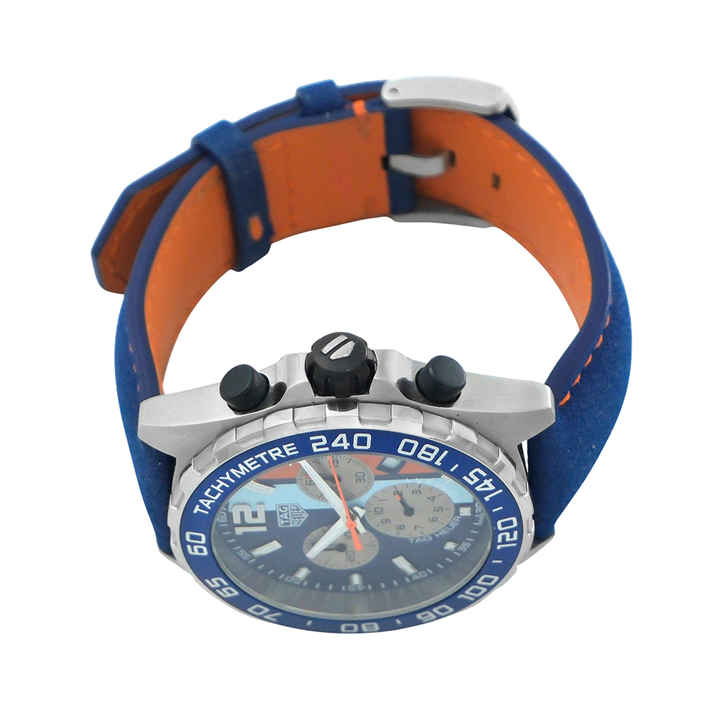 TAG Heuer Fórmula 1 Gulf 43mm Ref.-CAZ101N.FC8243 es un reloj de segunda mano autenticado y verificado con 2 años de garantía, estuche Tag Heuer y documentación. Año 2023. Muy buen estado de conservación. Equipado con movimiento de cuarzo, función cronógrafo y taquímetro, esfera azul con calendario y números árabes, luminiscencia, bisel giratorio unidireccional, caja de acero, cristal de zafiro, brazalete de acero con cierre desplegable y hermeticidad hasta 200 metros. Es una edición especial con grabado en la tapa trasera del logotipo Gulf.